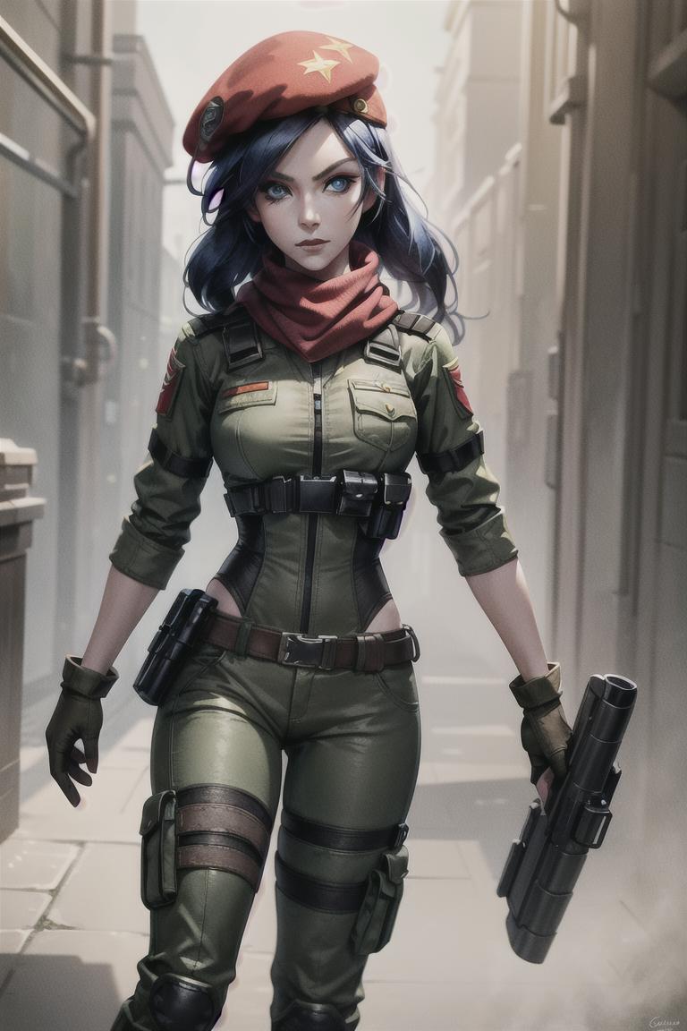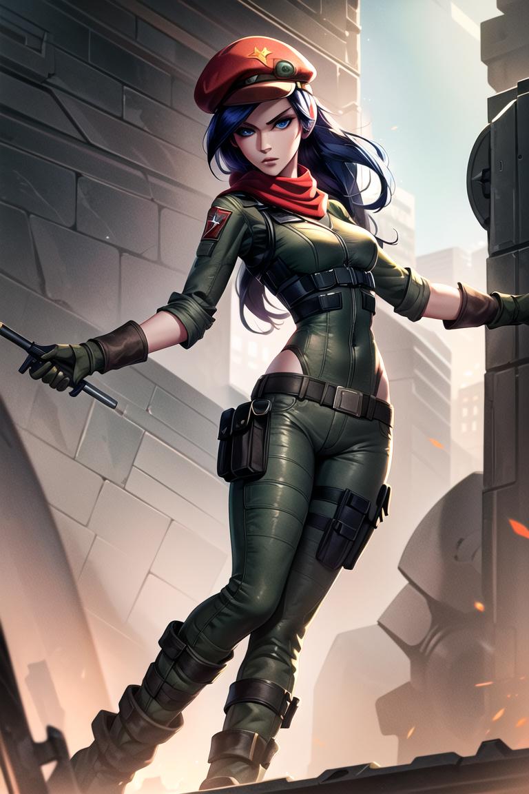 resistance caitlyn, red scarf, red hat, militar outfit, chest armor, green shirt, brown pants, knee boots, green gloves, ear intercomPool party: