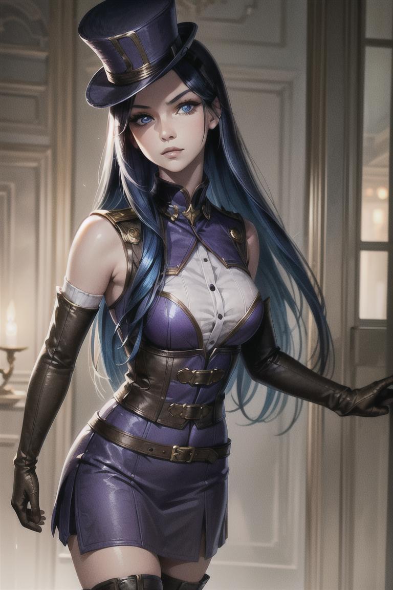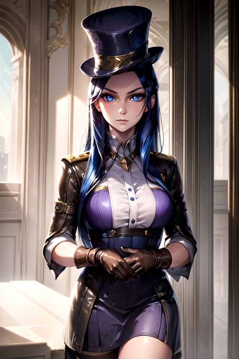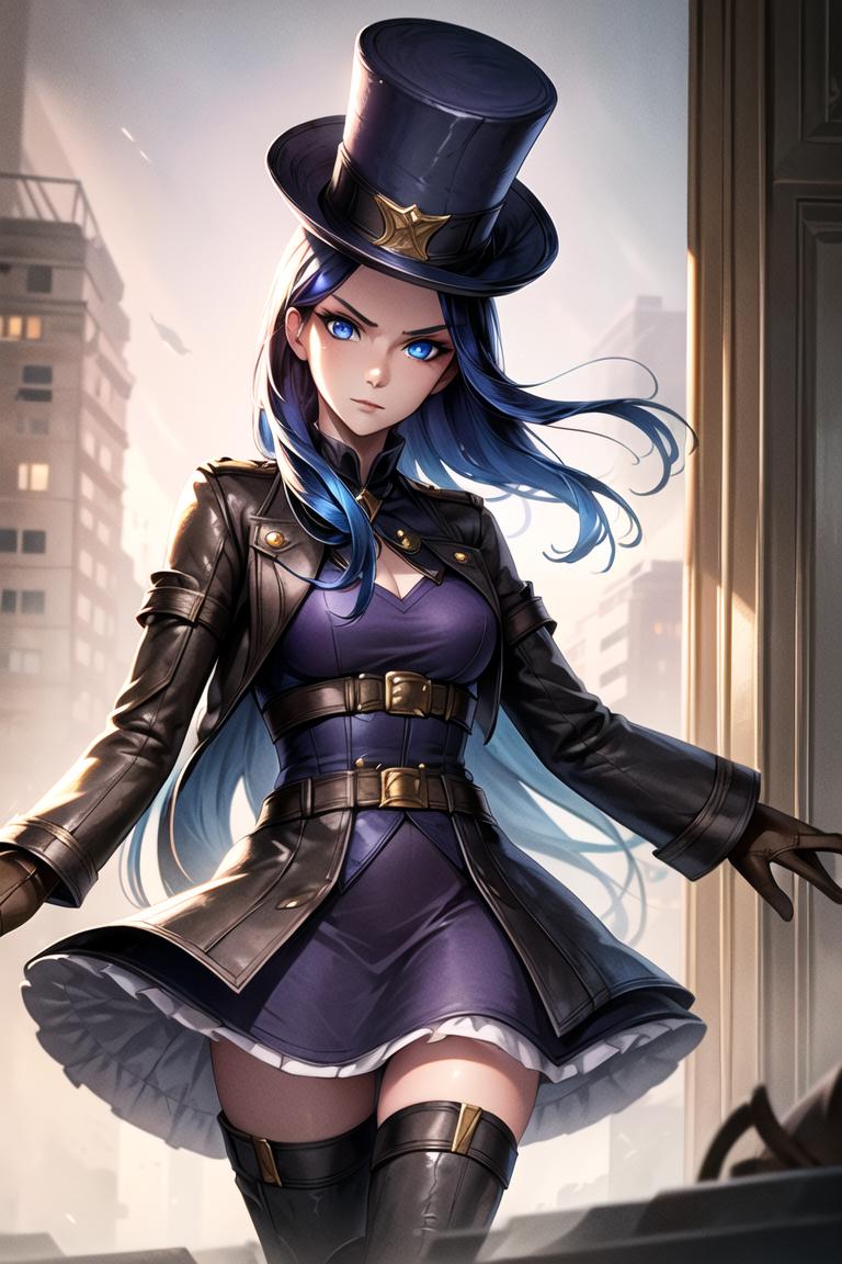 arcane caitlyn, purple jumpsuit, brown leather girdle, cleveage, knee boots, purple nailsArcade: