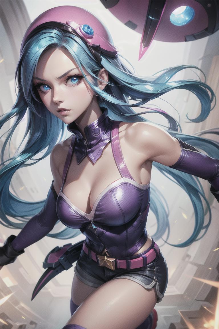 arcade caitlyn, star ornaments, light blue hair, medium hair, pink hat, purple sweater, blue mini shorts, purple gloves, pink belt, pink capelete, thighhighsResistance:
