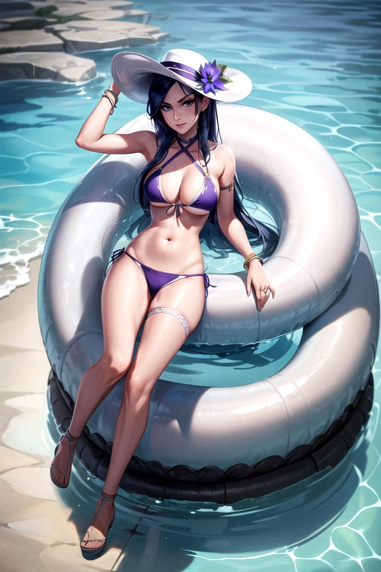 pool party caitlyn, white hat, purple bikini, front-tie bikini, halterneck, cleveage, bridal garter, white heels, gold braceletDescription