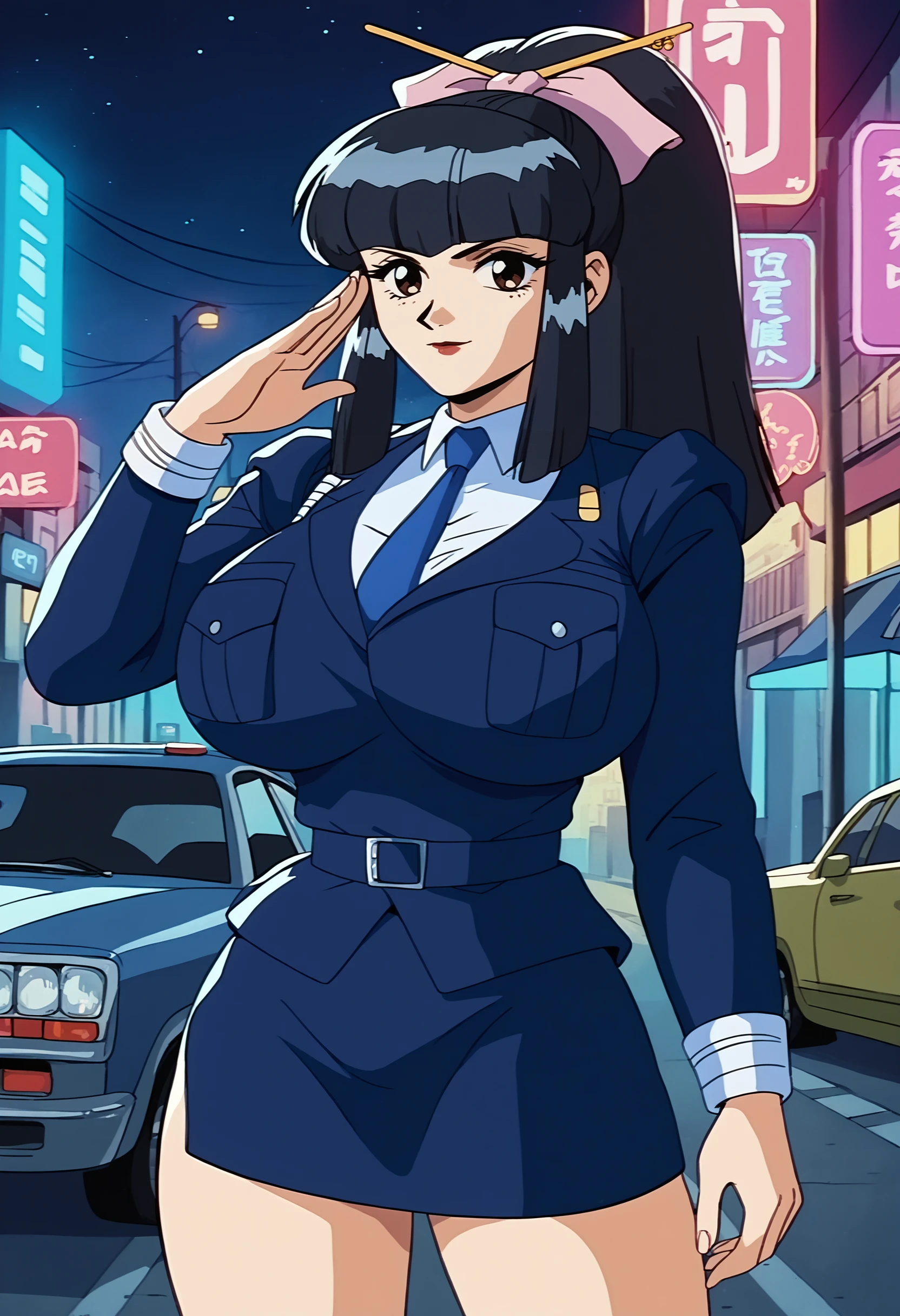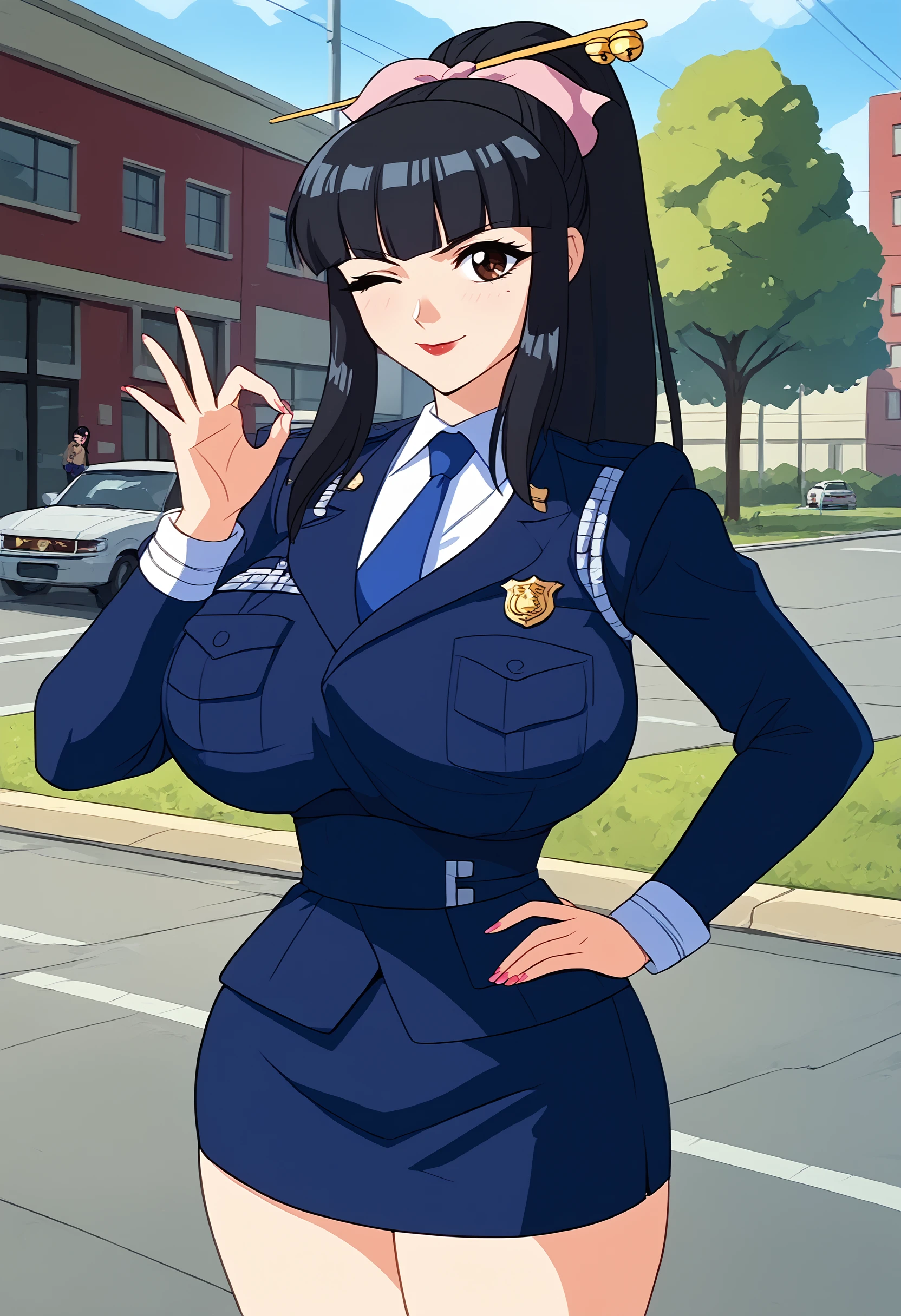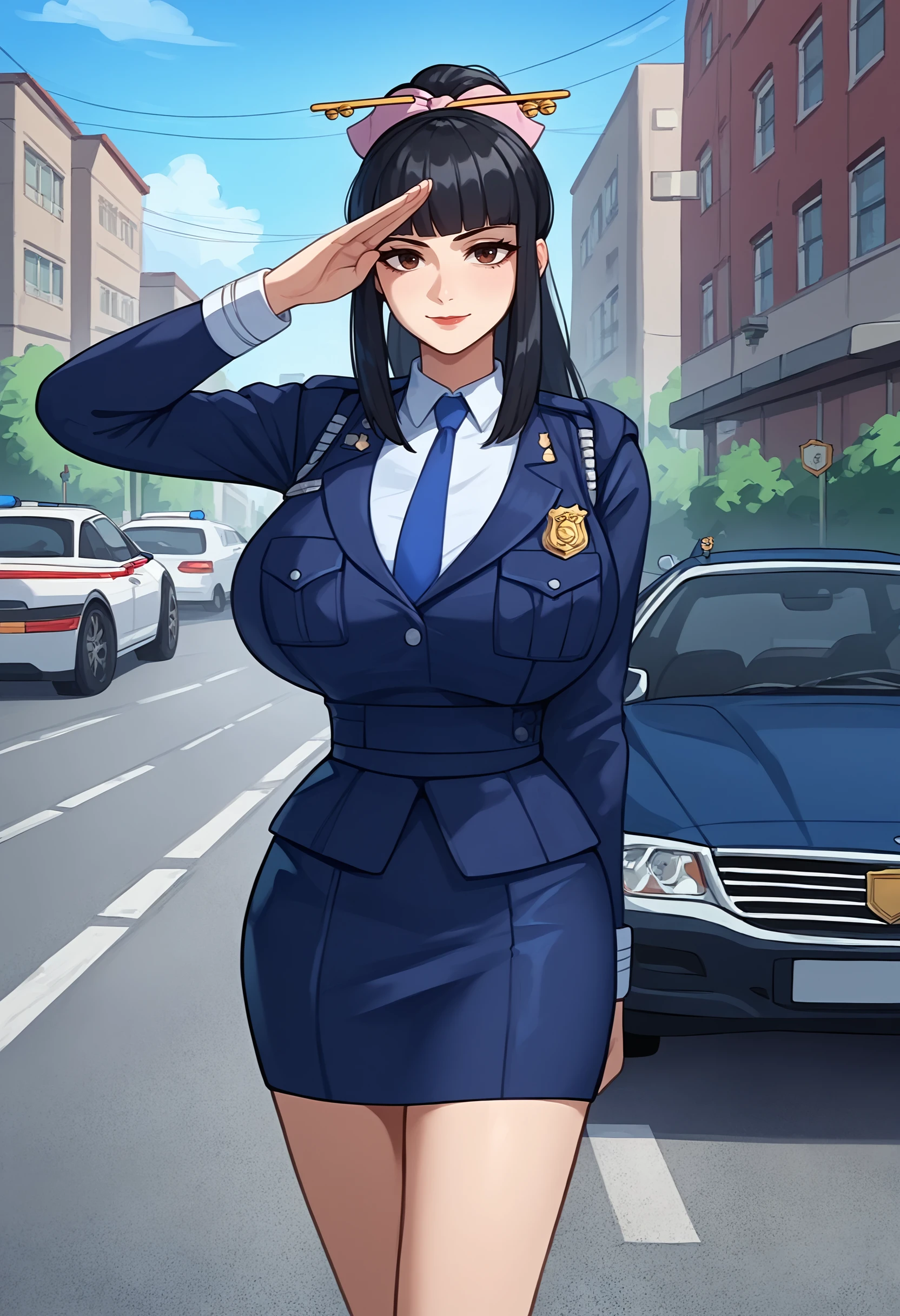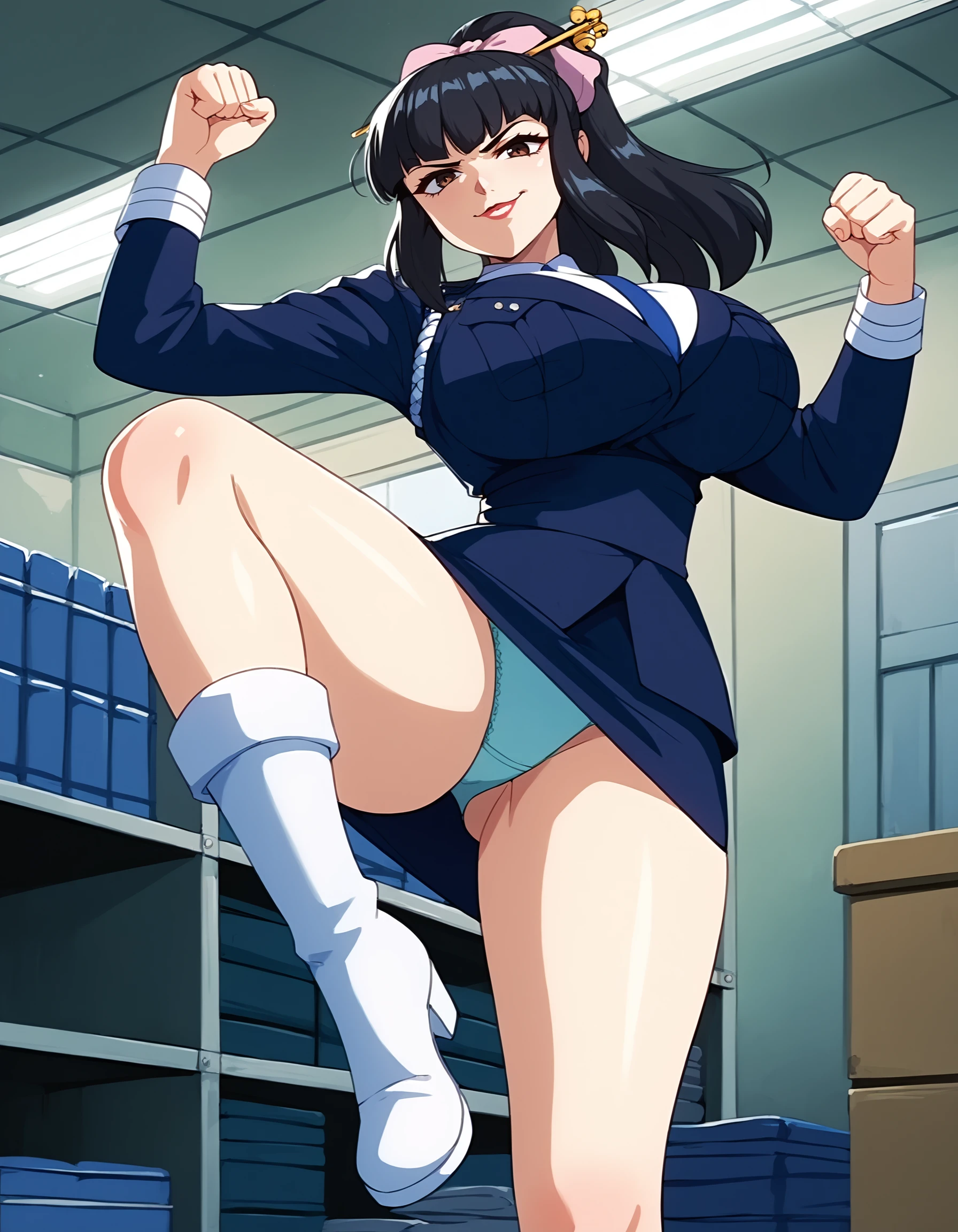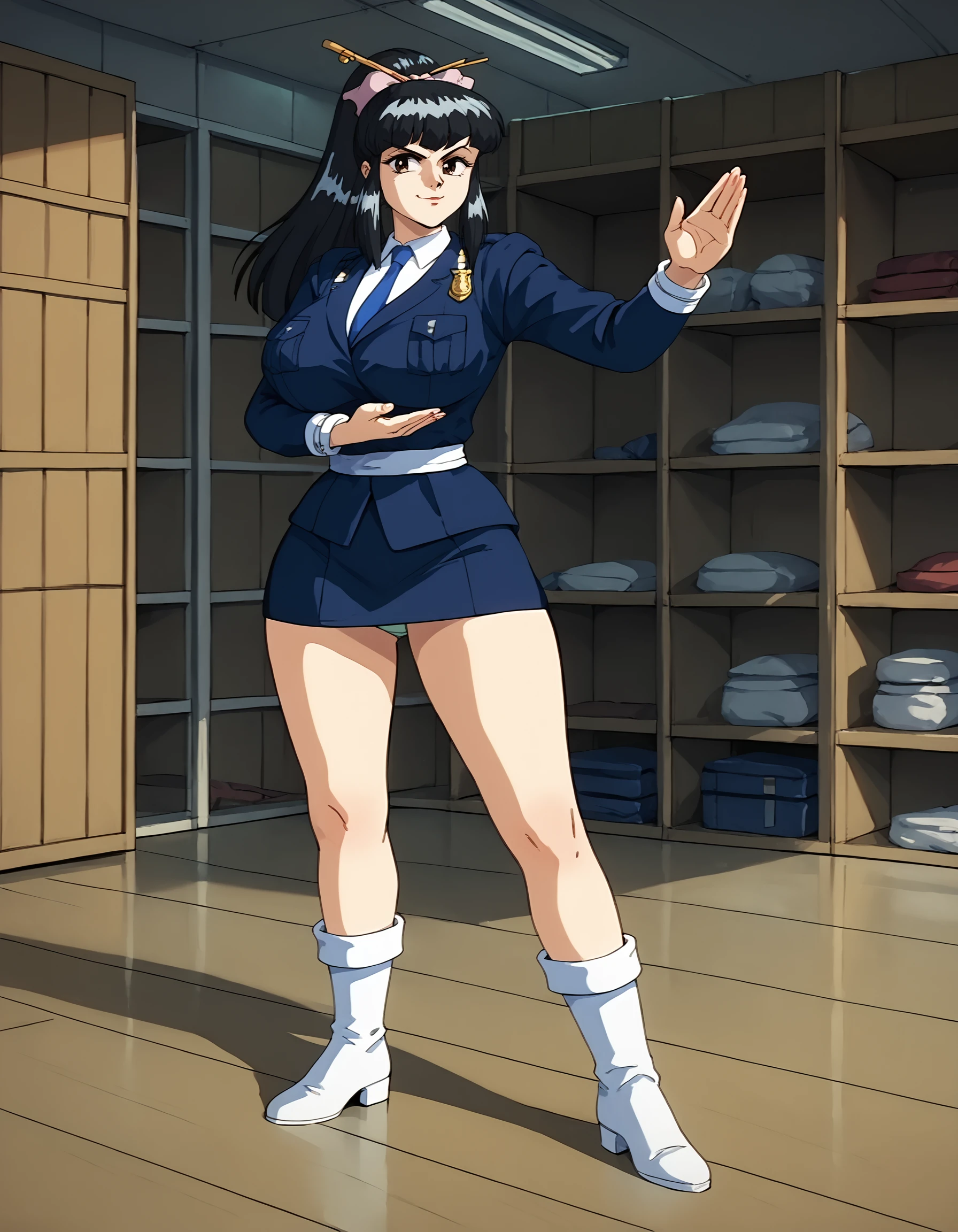 police uniform, blue skirt, miniskirt, necktie, ankle boots, white footwear,