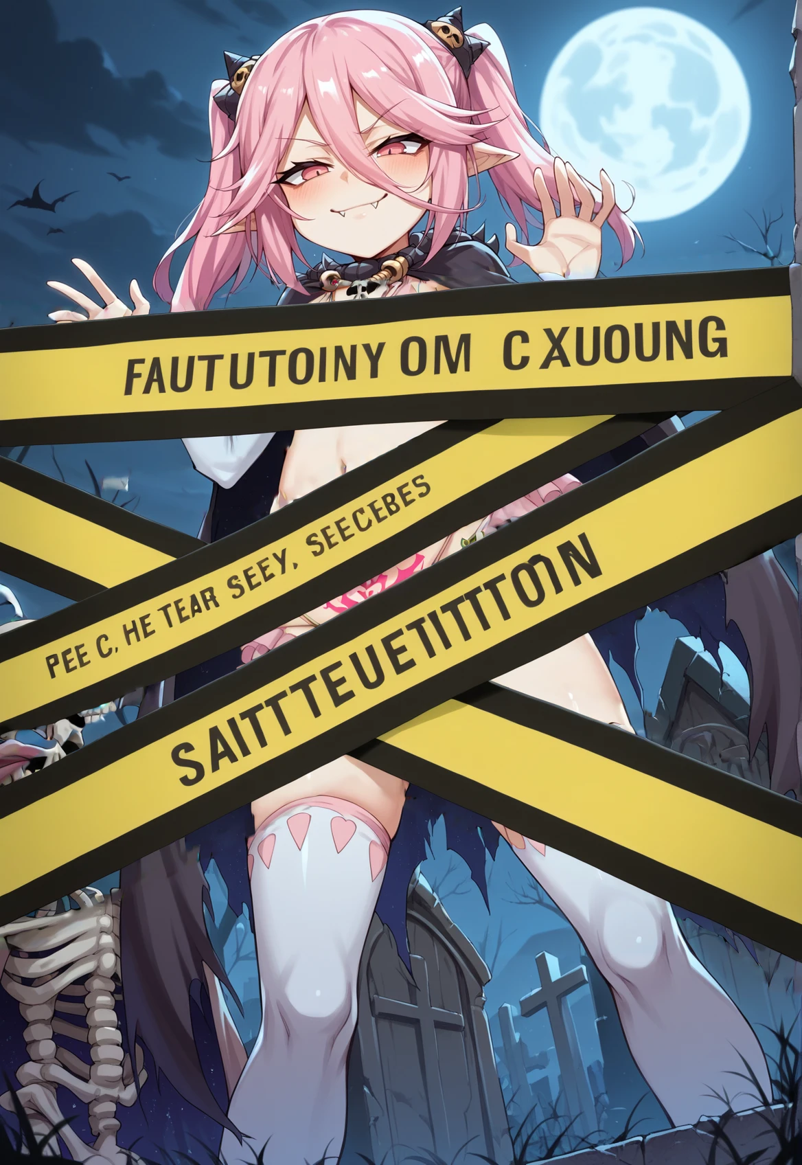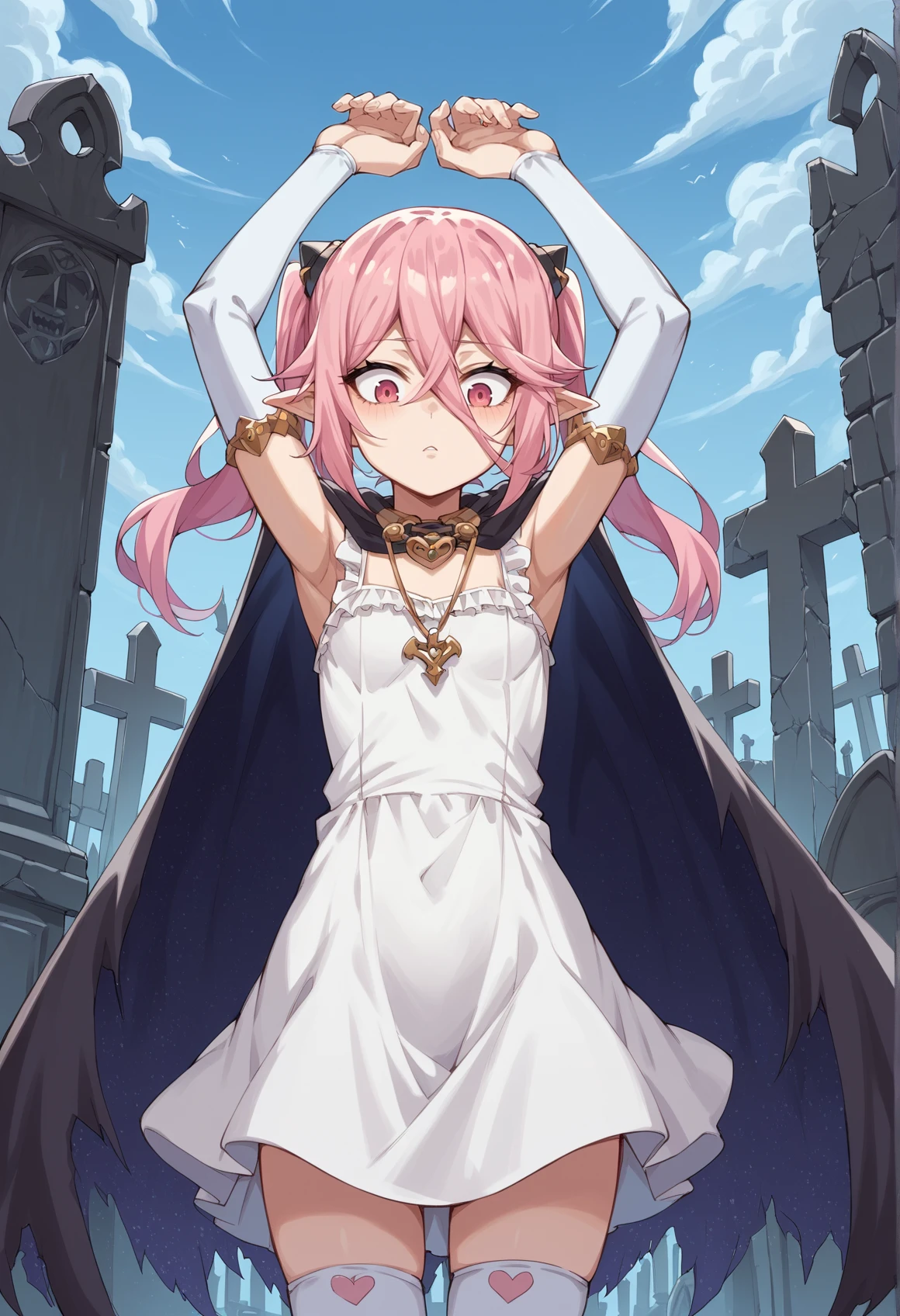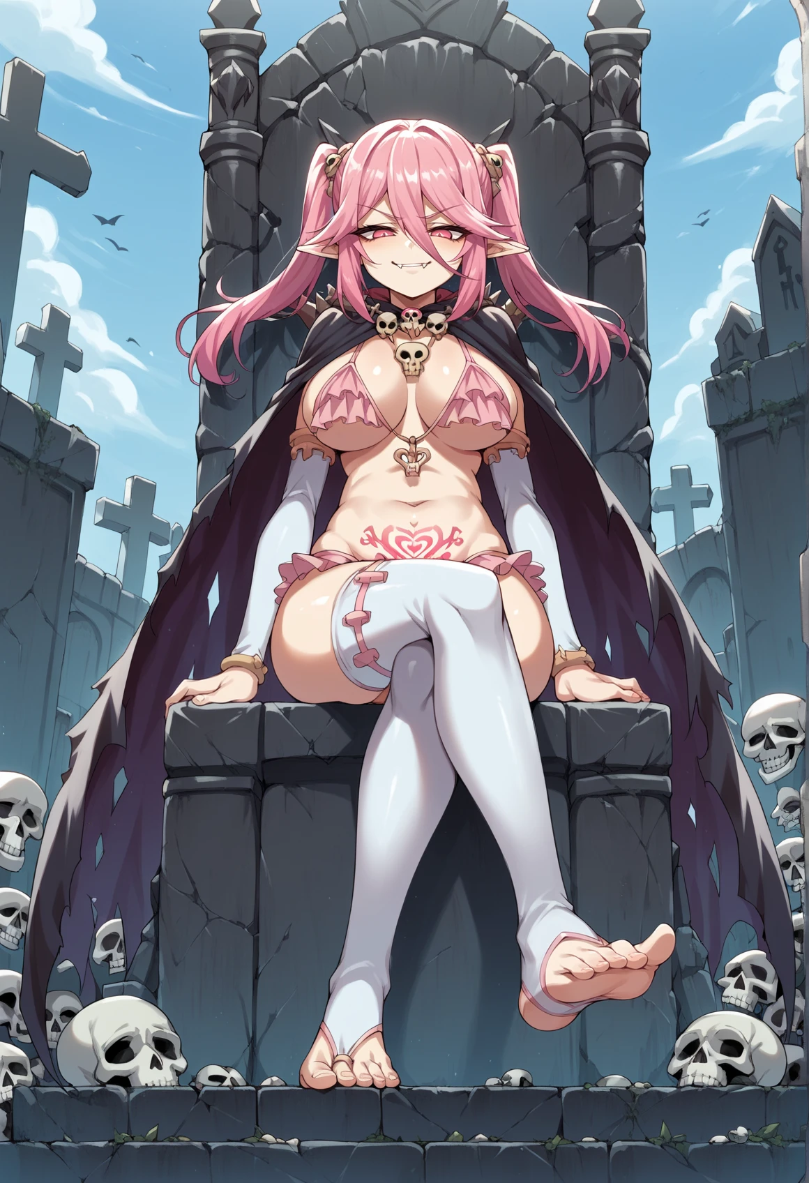 pink hair, pink eyes, twintails, hair ornament, bikini, frills, pubic tattoo, pendant, bridal gauntlets, cape, thighhighs, toeless legwear, pointy ears,