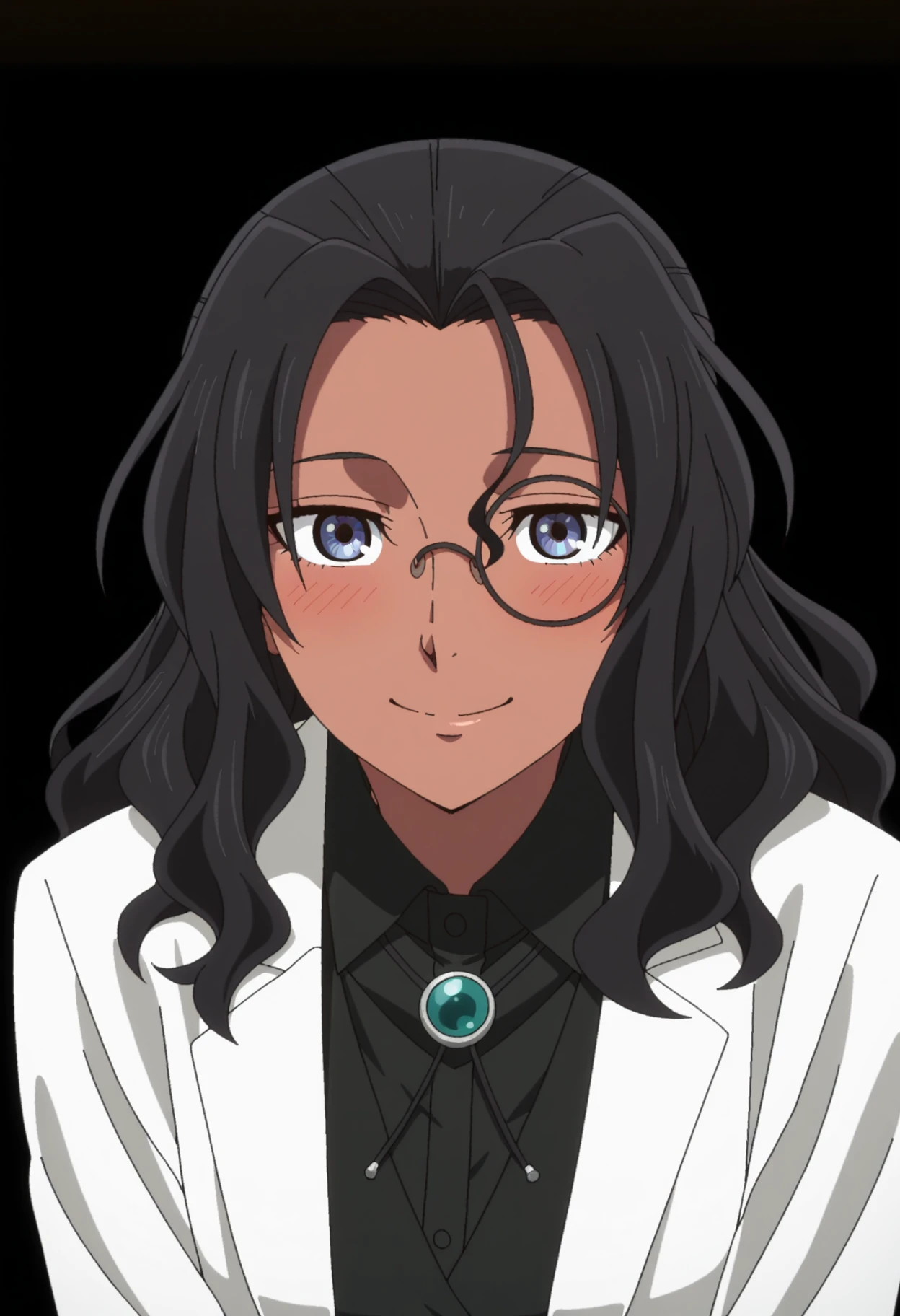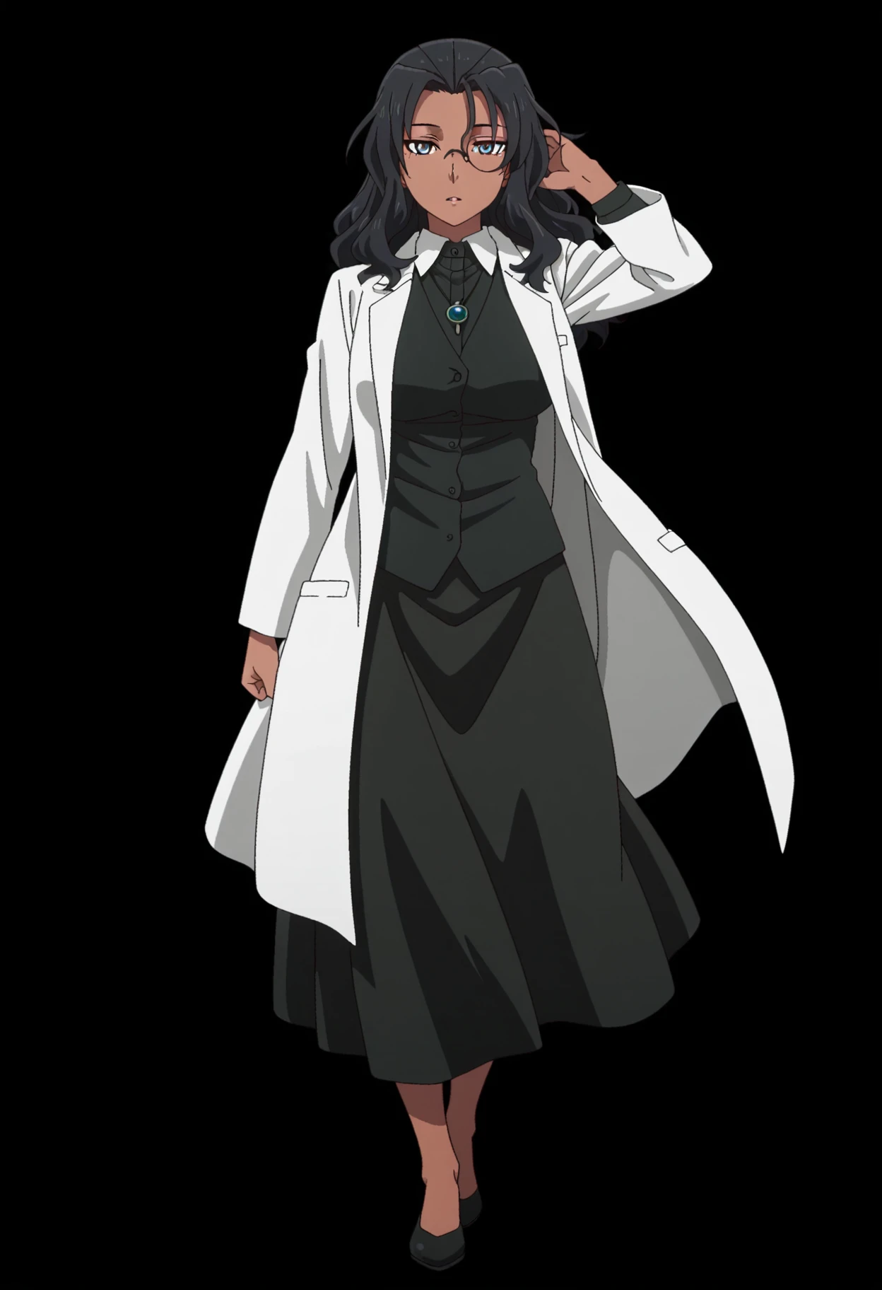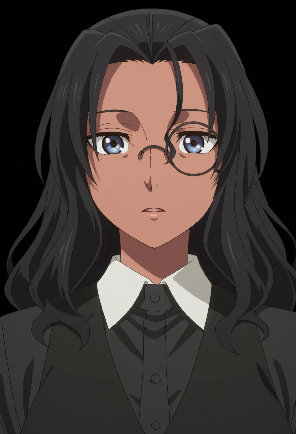 1girl, solo, rahab, mature female, black hair, long hair, blue eyes, dark skin, dark-skinned female, glasses