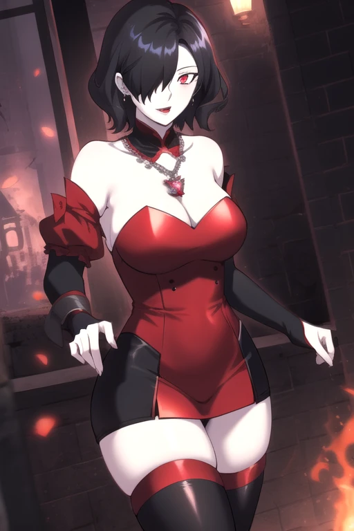 ViscountLatina, 1girl, solo, short hair, large breasts, black hair, red eyes, black thighhighs, dress, cleavage, bare shoulders, jewelry, collarbone, earrings, detached sleeves, necklace, hair over one eye, strapless, detached collar, colored skin, white skin, gem, pale skin, bridal gauntlets, pendant, red lips, vampire