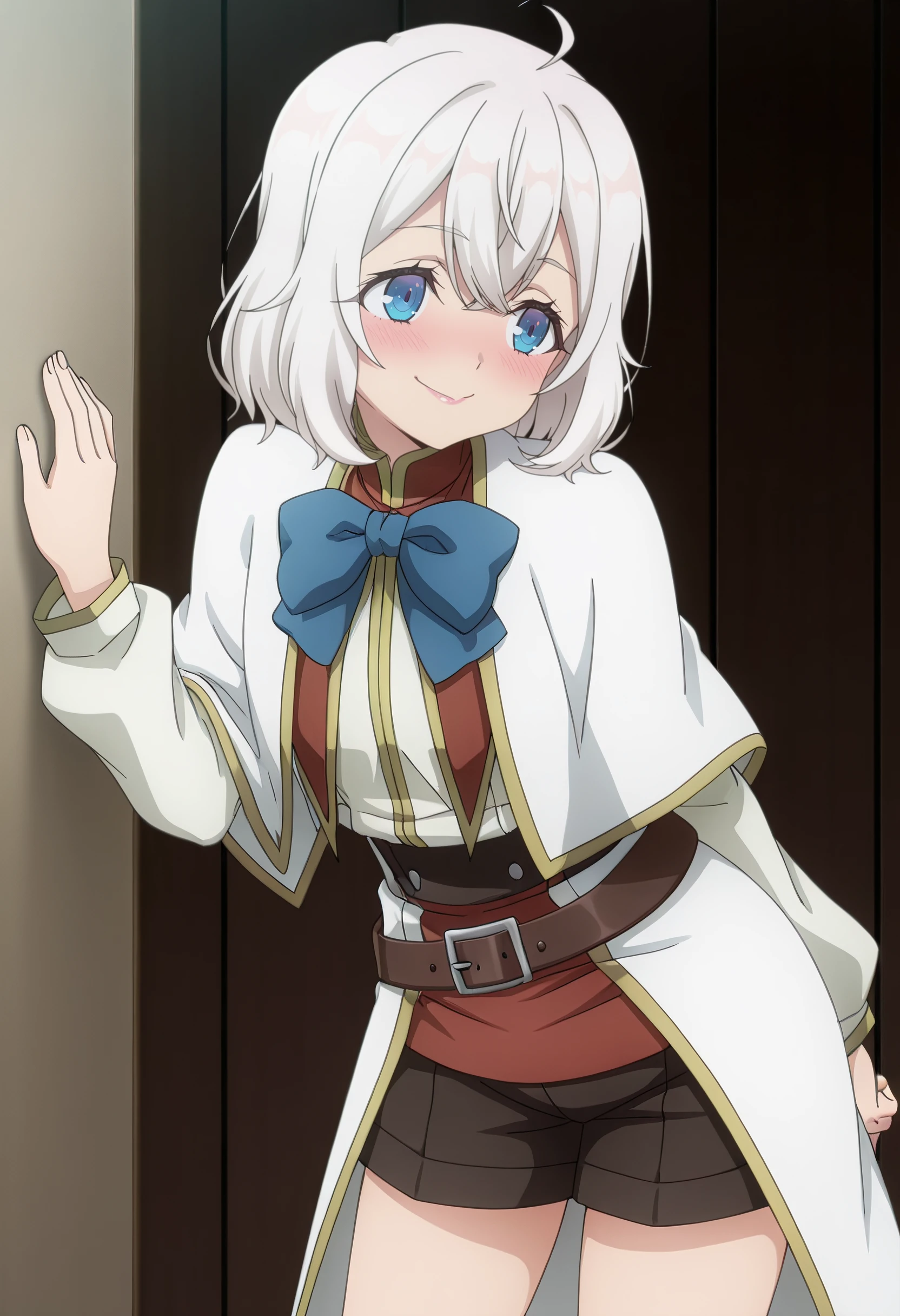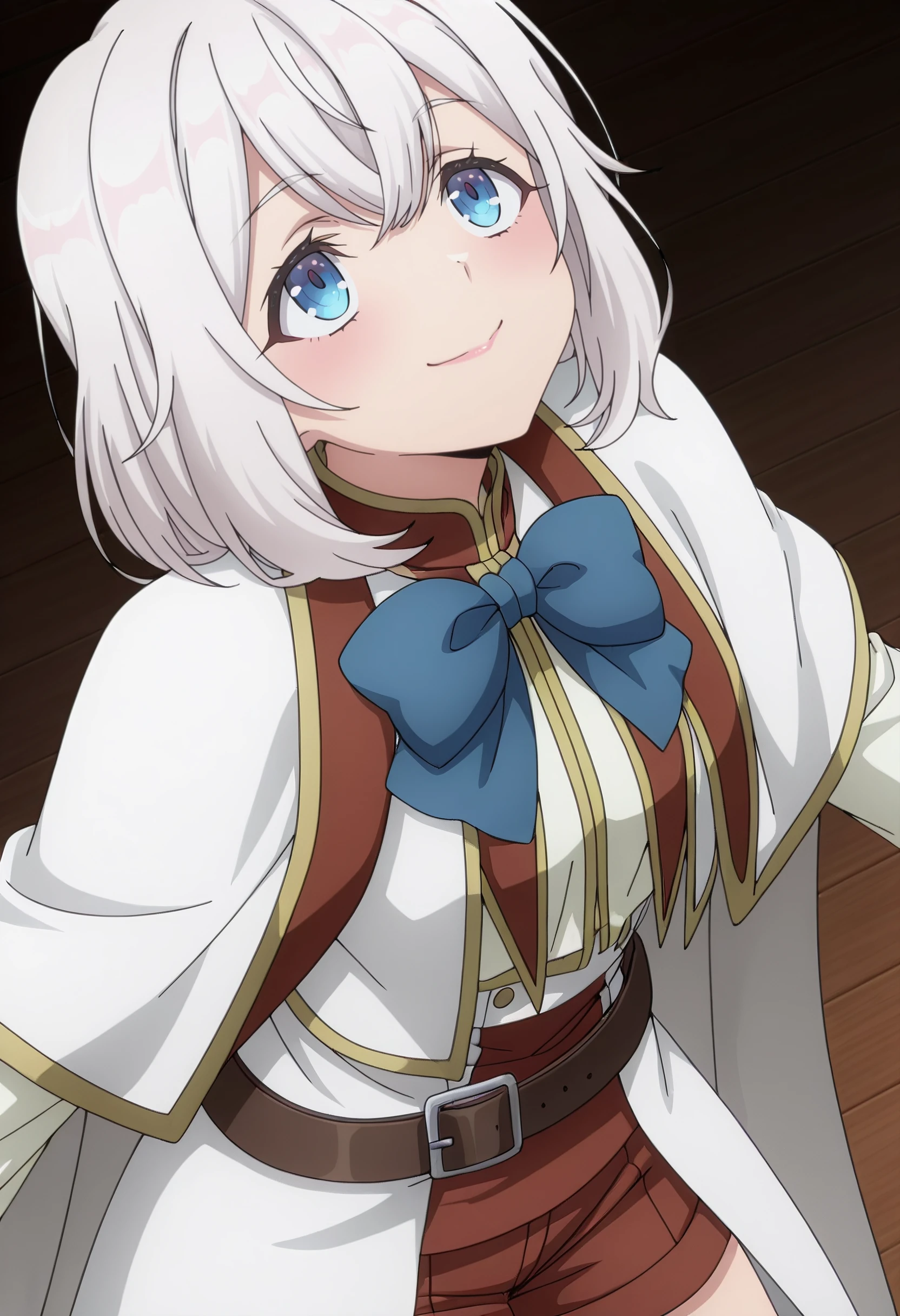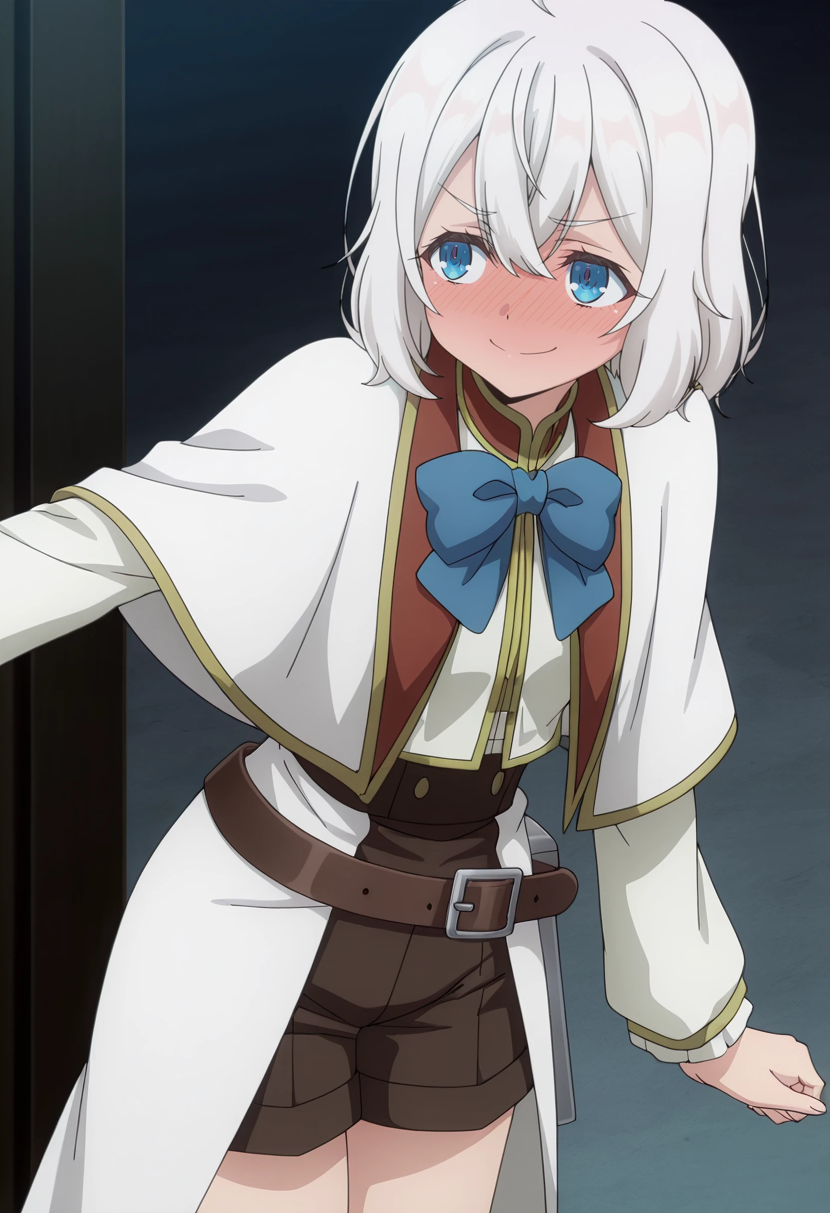 LynnStandard, shirt, blue bow, bow, bowtie, blue bowtie, white shirt, long sleeves, collared shirt, belt, cape, jacket, blue neckwear, capelet, shorts, white jacket, belt buckle, brown shorts,