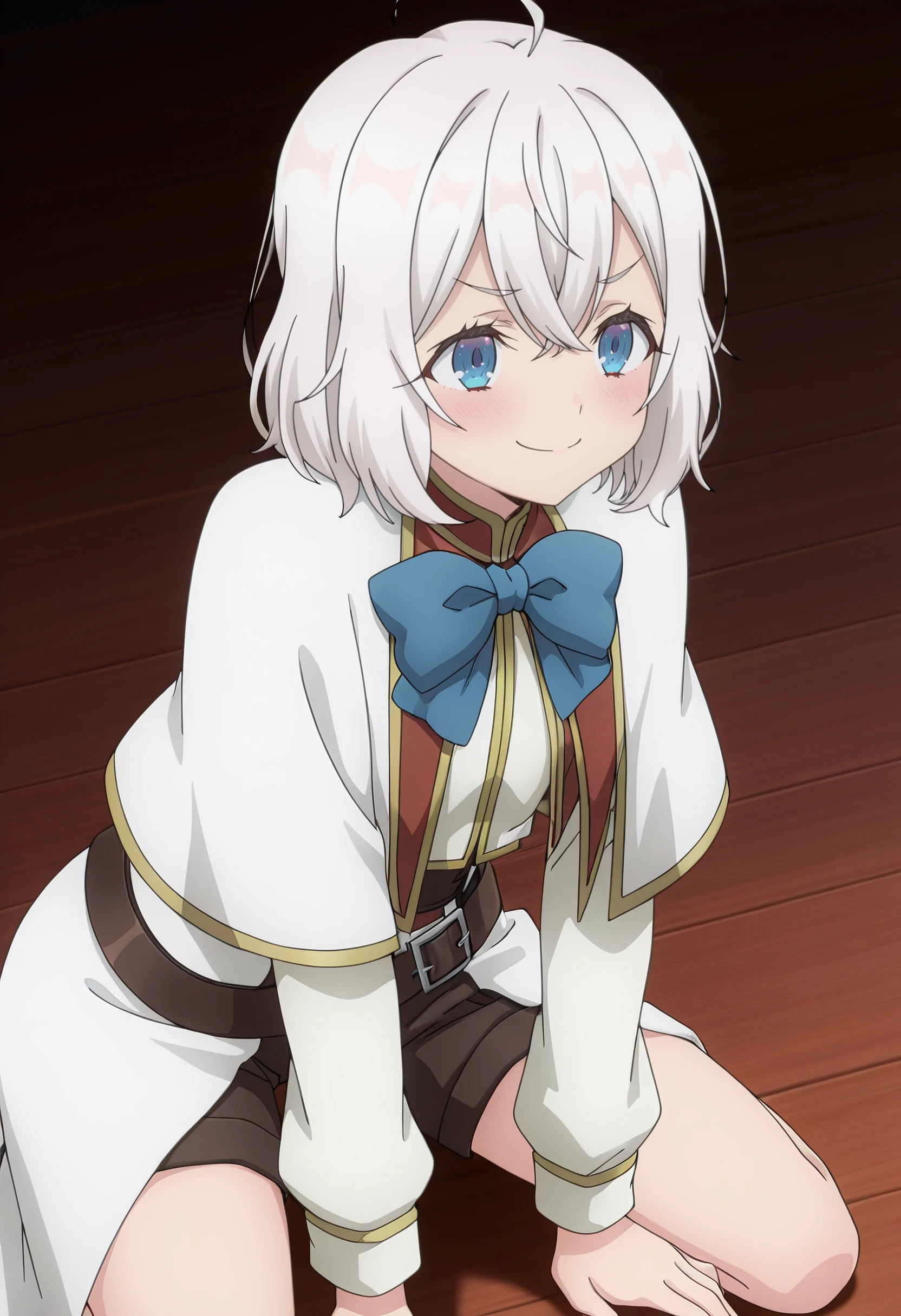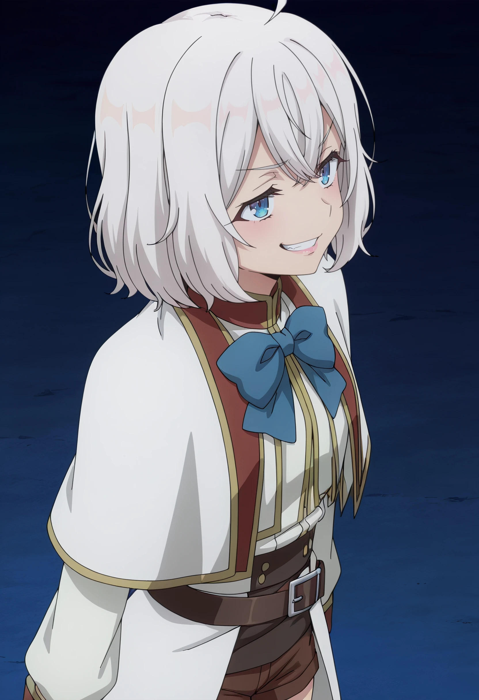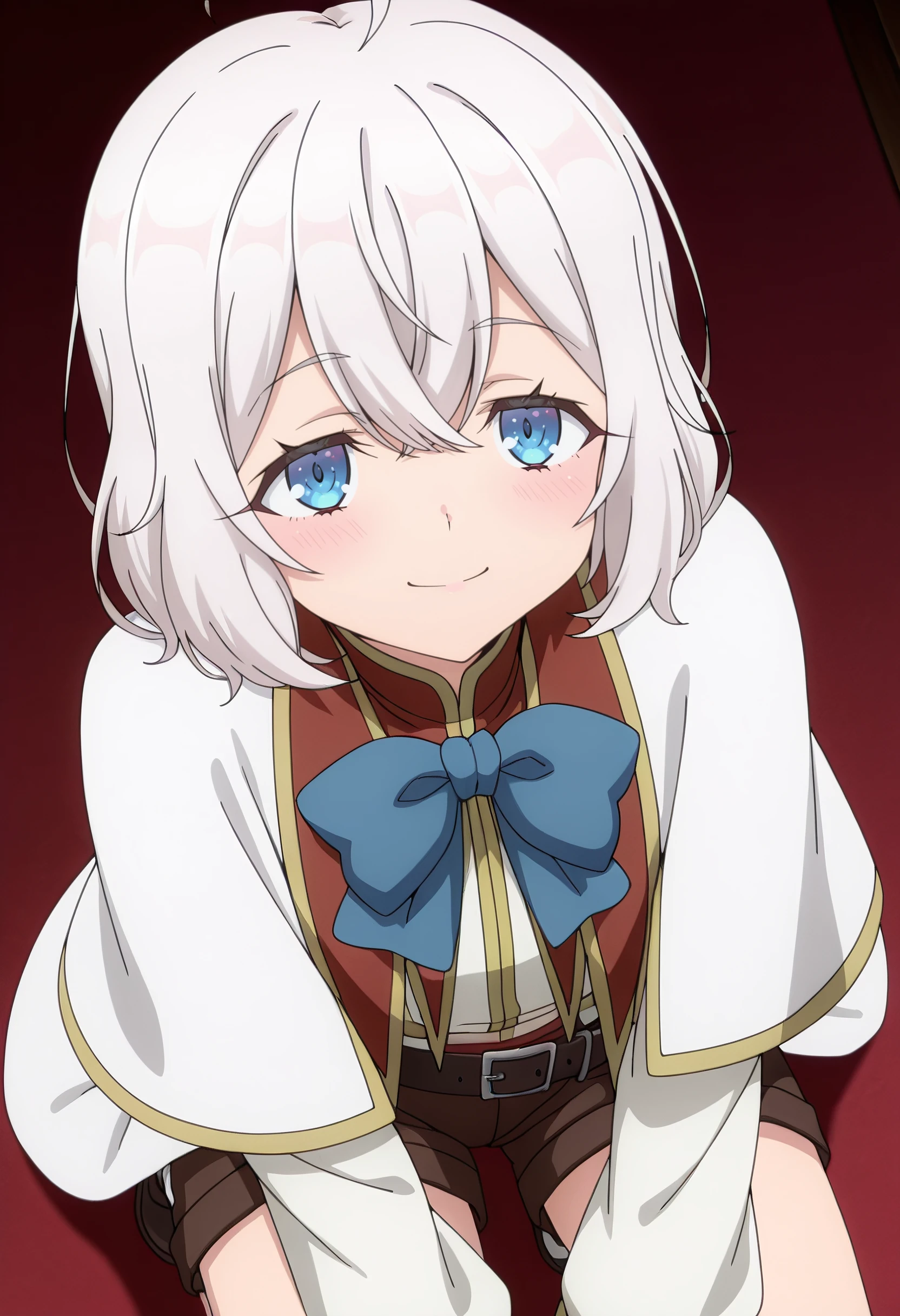 LynnStandard, shirt, blue bow, bow, bowtie, blue bowtie, white shirt, long sleeves, collared shirt, belt, cape, jacket, blue neckwear, capelet, shorts, white jacket, belt buckle, brown shorts,