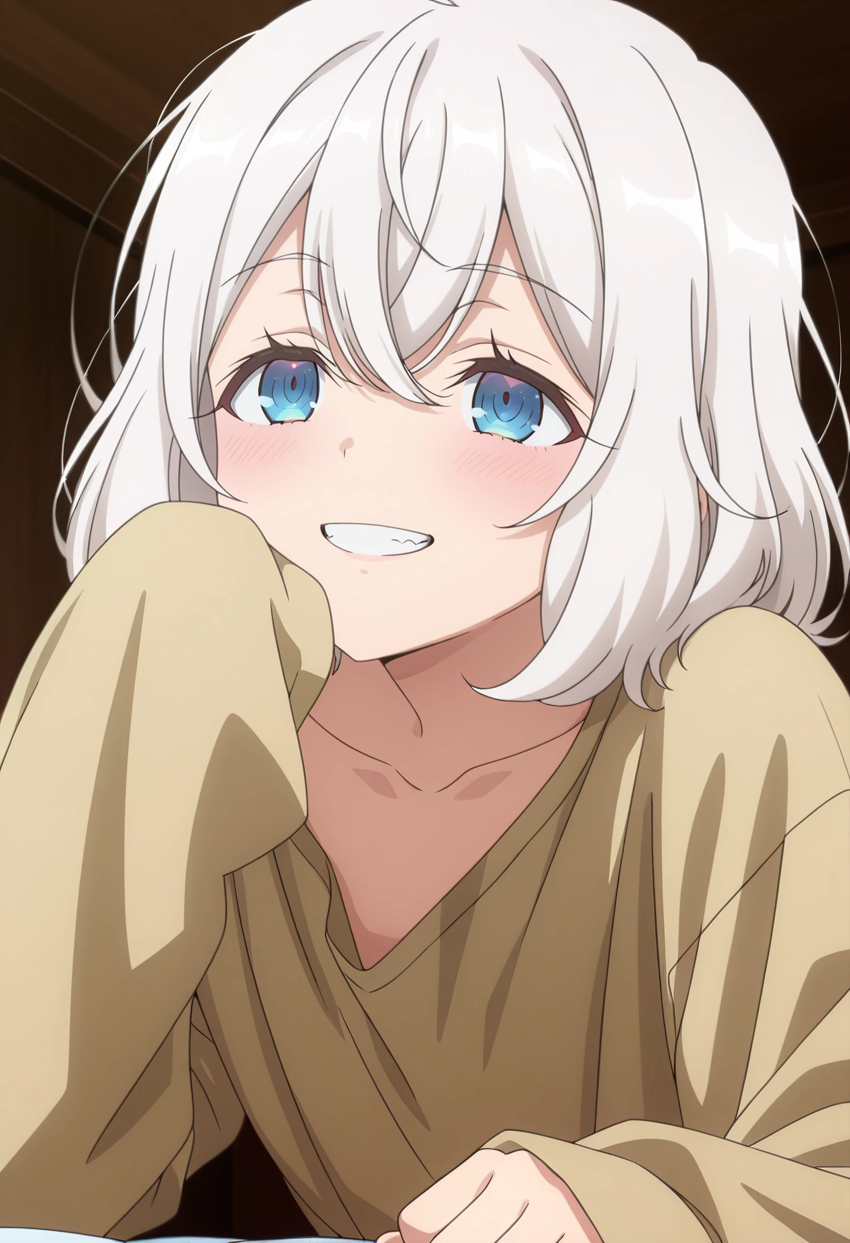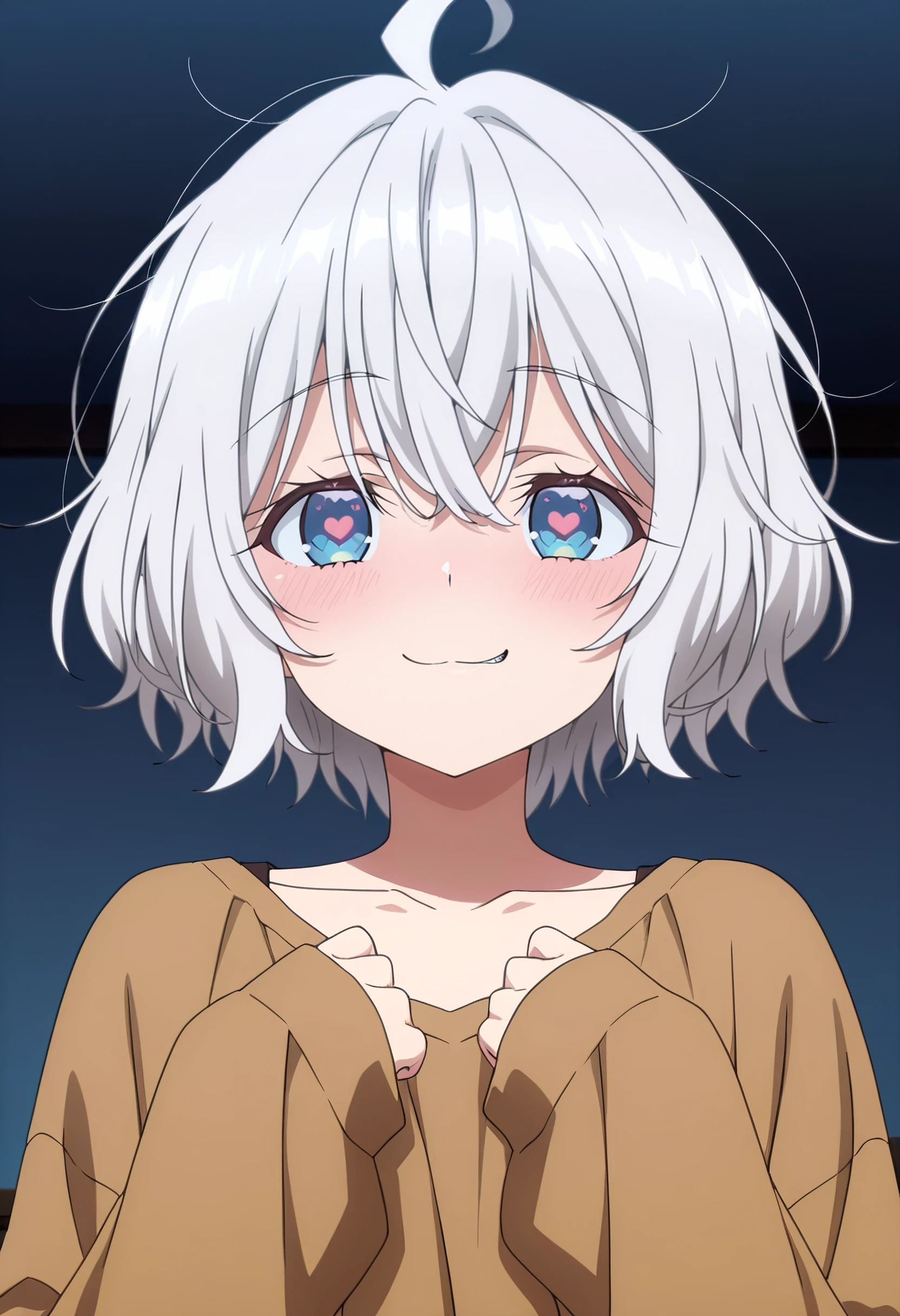 GirLynn, short hair, bangs, hair between eyes, eyebrows visible through hair, blue eyes, ahoge, silver hair,
