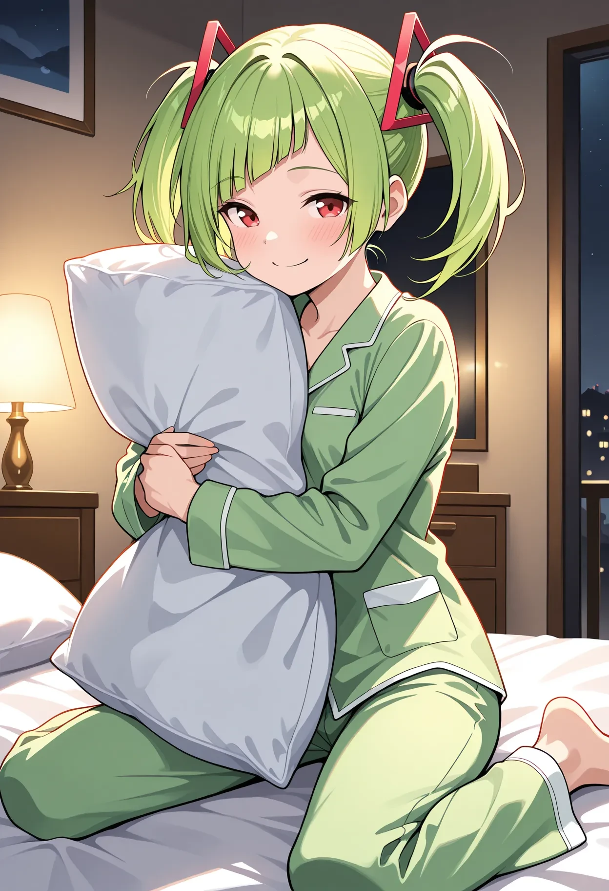 DelutayaCute, green hair, red eyes, diagonal bangs, small breasts, short hair, short twintails, triangle hair ornament