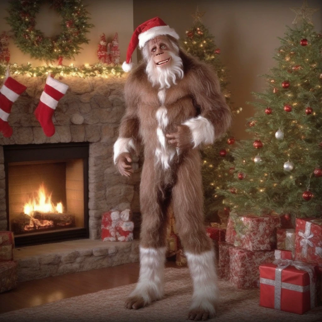 sasquatch, bigfoot, humanoid creature, wild reddish-brown fur, sharp white beard,