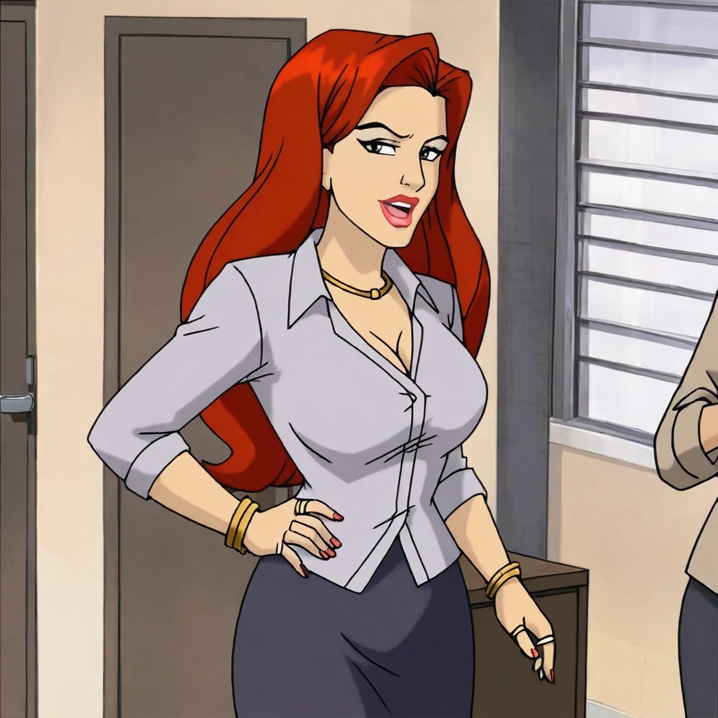 Trigger with pencil skirt: jeangreyEveryDayEvolution, 1girl, jewelry, pencil skirt, long hair, red hair, ring, necklace, bracelet, lipstick, large breasts, makeup
