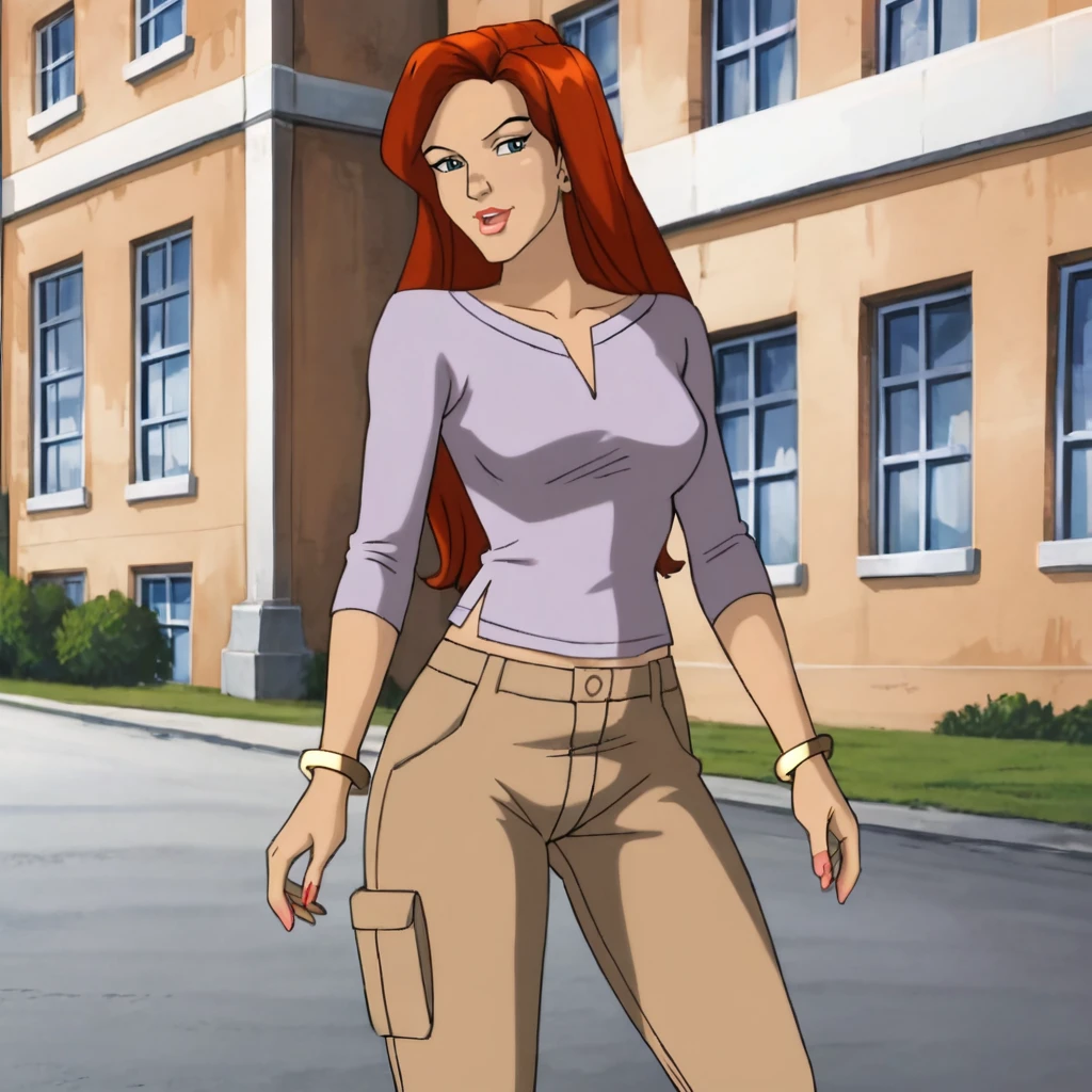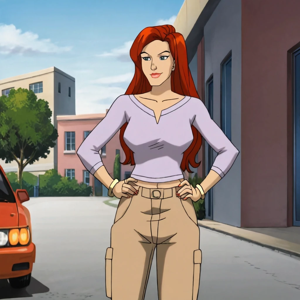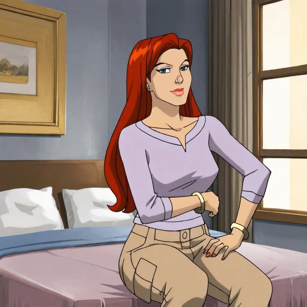 Trigger : jeangreyPurpleEvolution, 1girl, long hair, jewelry, pants, red hair, bracelet, blue eyes, makeup, lipstick, mature female, hands on waist,
