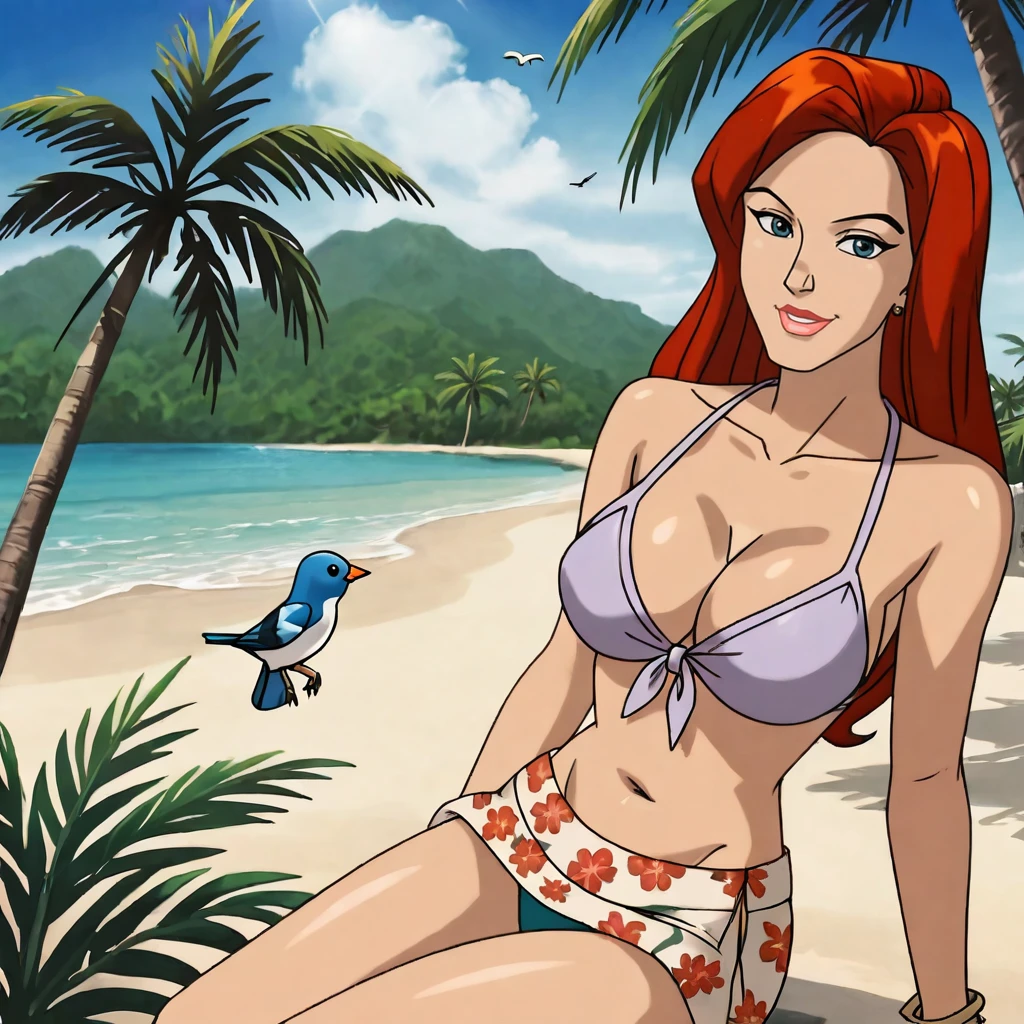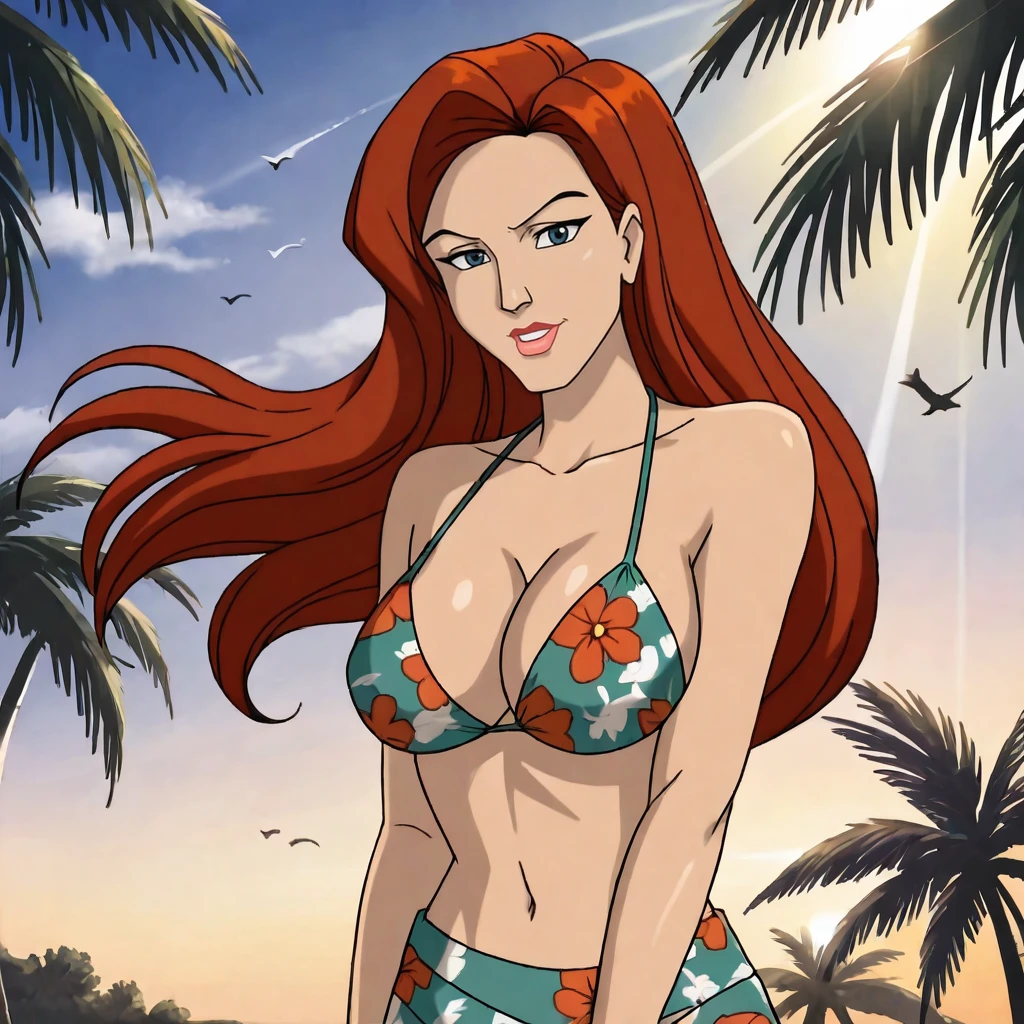Trigger with costume: jeangreyCostumeEvolution, 1girl, long hair, bodysuit, headband, red hair, lipstick, large breasts, green eyes, makeup, retro artstyle, lips, cowboy shot