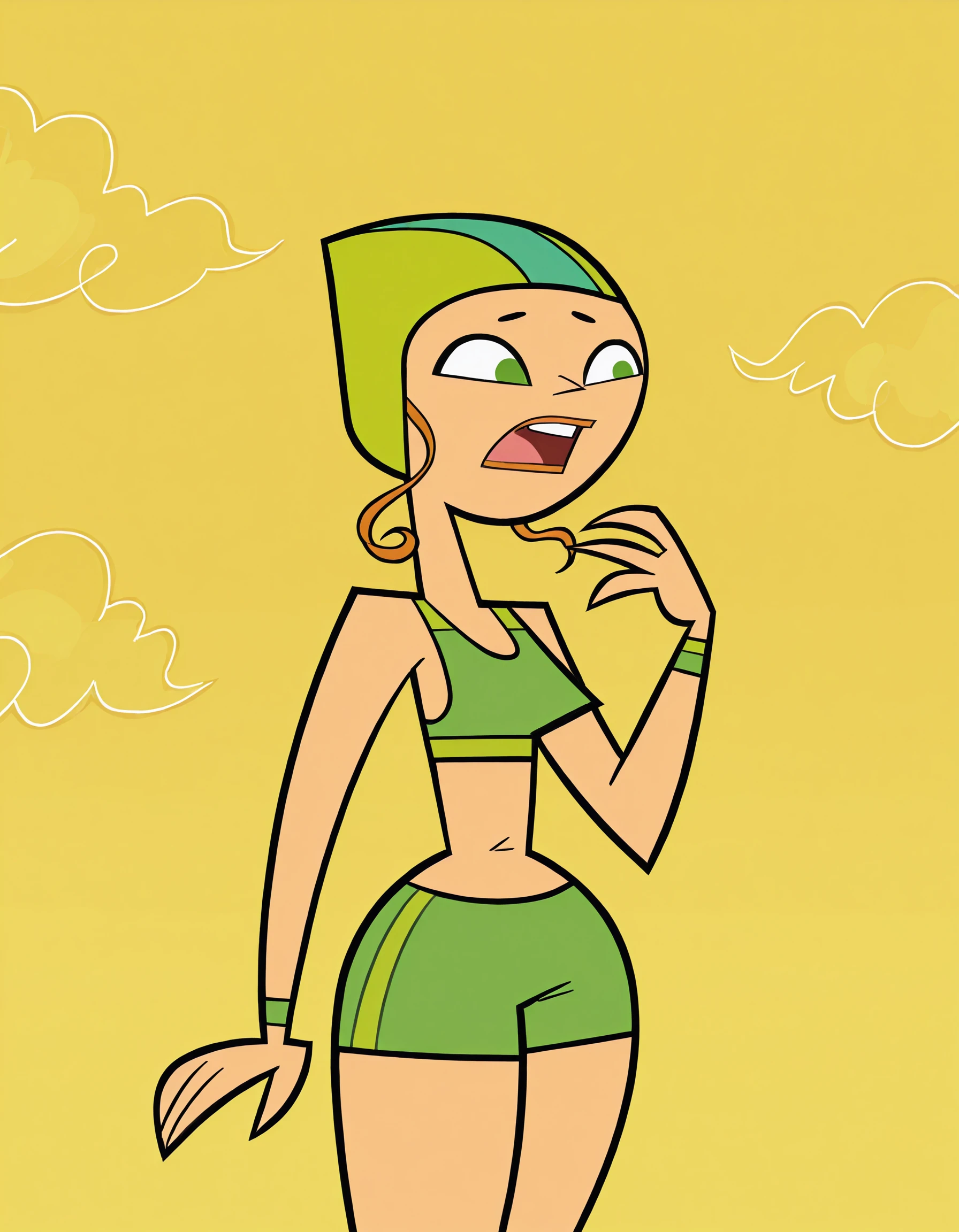 izzytd, orange hair, 1girl, crop top, clothing cutout, long hair, green eyes, solo,lips, midriff, shorts, wristband, skirt, smile, cleavage cutout, green footwear