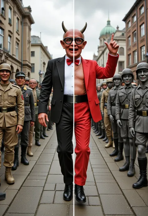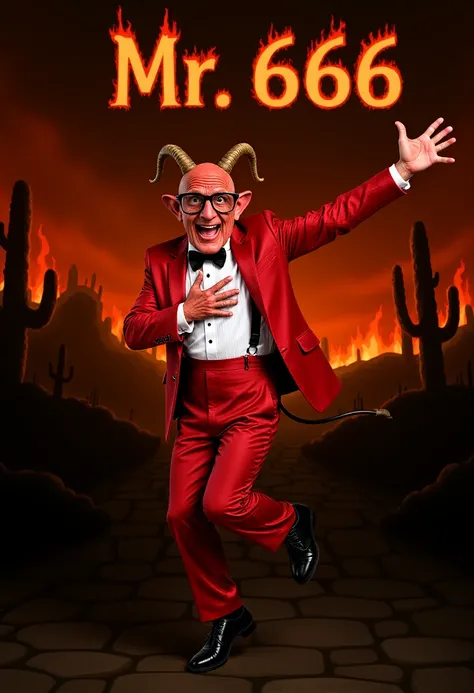 Trigger: 6FDM "man" should result in the original Mr Six which should include the glasses, two tone shoes, black suit and red tie with red suspender. (for Mr 666 modify with "devil man" adding "red skinned" "horns" or "goat horns" "red suit" "black bow tie")