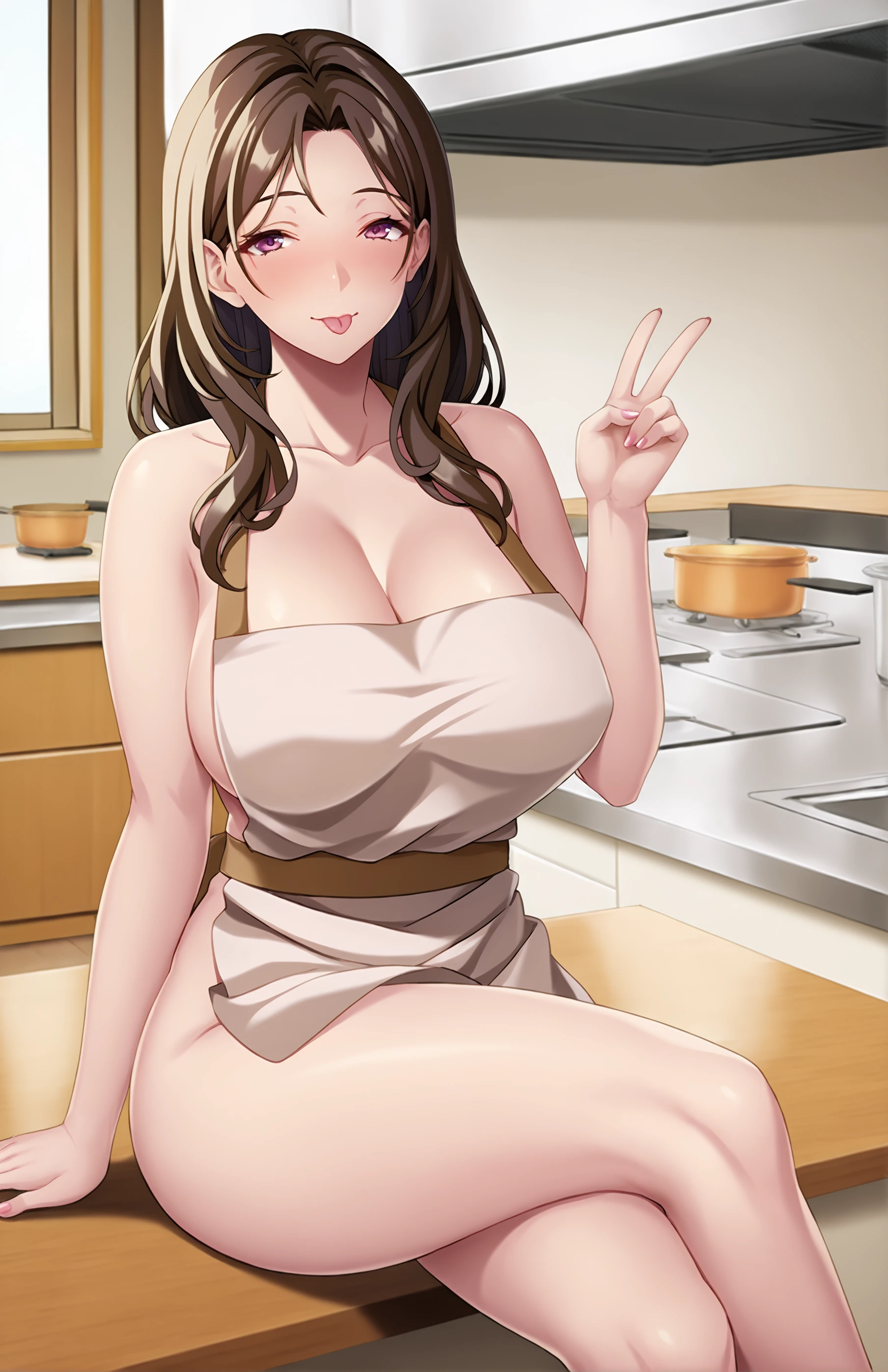 UenoharaRingo, long hair, breasts, bangs, large breasts, brown hair, cleavage, bare shoulders, brown eyes, purple eyes, collarbone, beige apron, long apron, straight apron, mature female, apron
