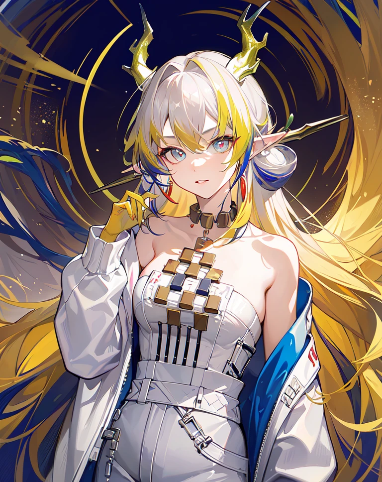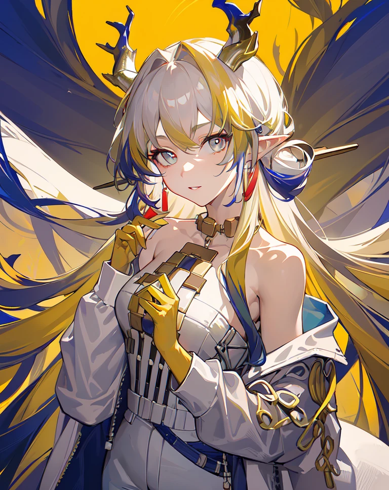 <lora:shu:0.7>,solo,1girl,long_hair,looking_at_viewer,pointy_ears,bare_shoulders,multicolored_hair,jewelry,horns,masterpiece,best quality,highres,absurdres,