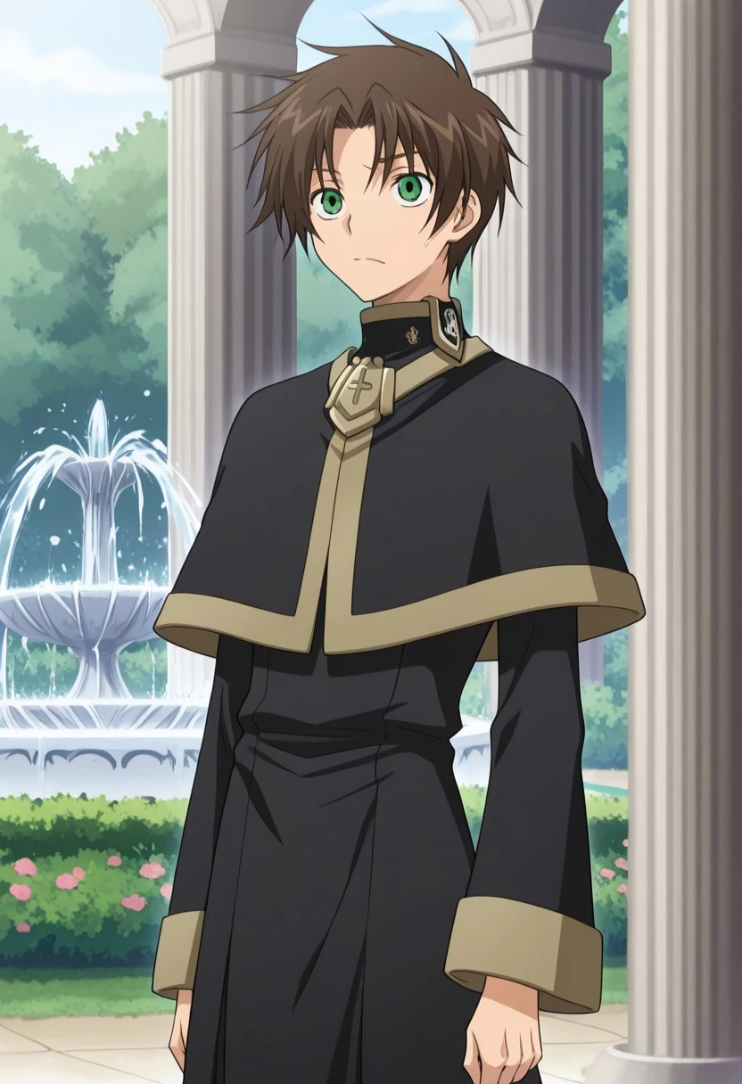 TeitoKlein, 1boy, male focus, solo, green eyes, brown hair, robe, black robe, capelet, black capelet, pants, black pants, boots, brown footwear