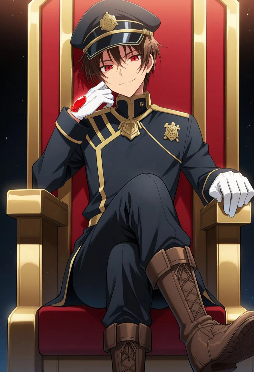 TeitoKlein, 1boy, male focus, solo, green eyes, brown hair, military uniform, jacket, black jacket, gloves, white gloves, pants, black pants, boots, brown footwear,