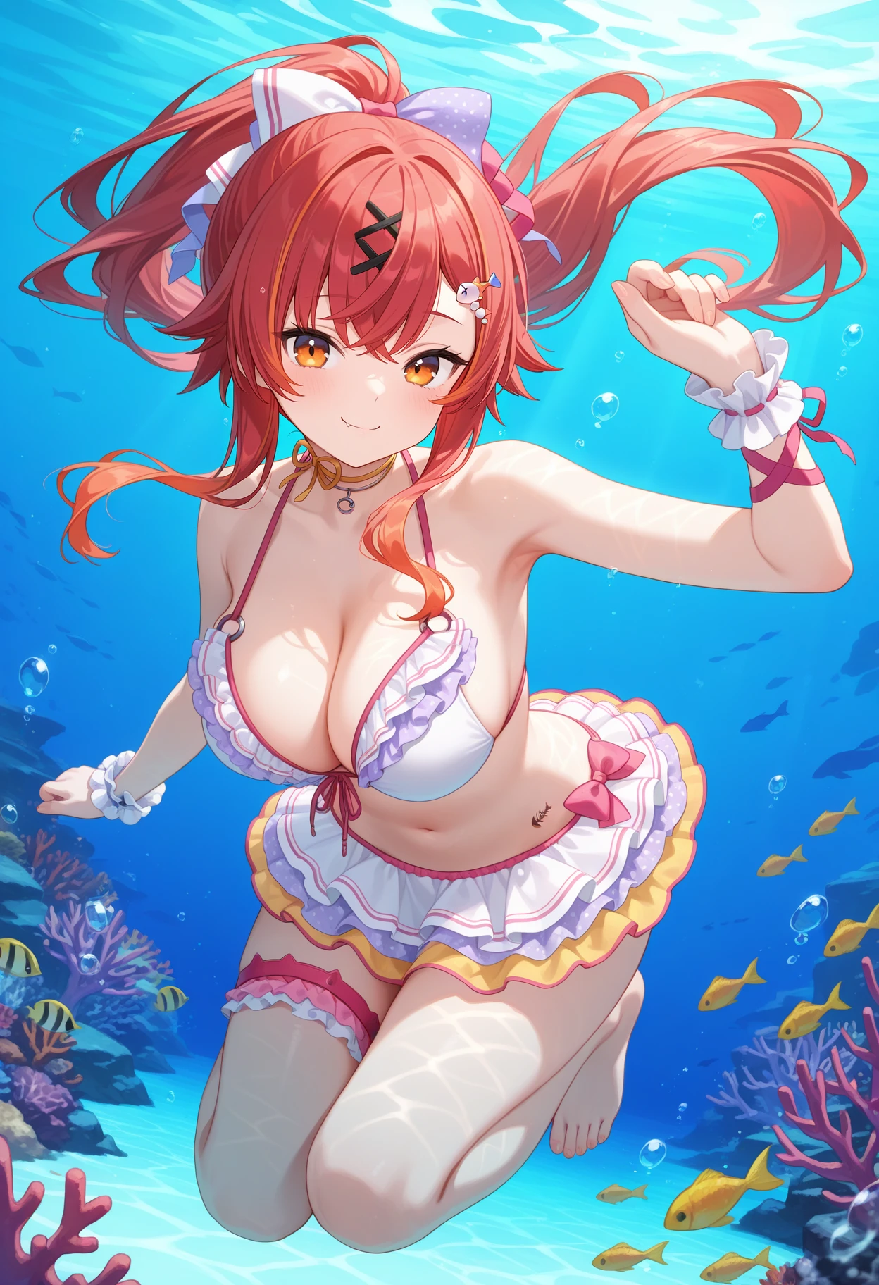 outfit4bbtsuna, long hair, red hair, ponytail, hair bow, hair ornament, orange eyes, fang, ribbon choker, cleavage, frilled bikini, white bikini, wrist cuffs, stomach tattoo, bikini skirt, layered skirt, thigh strap