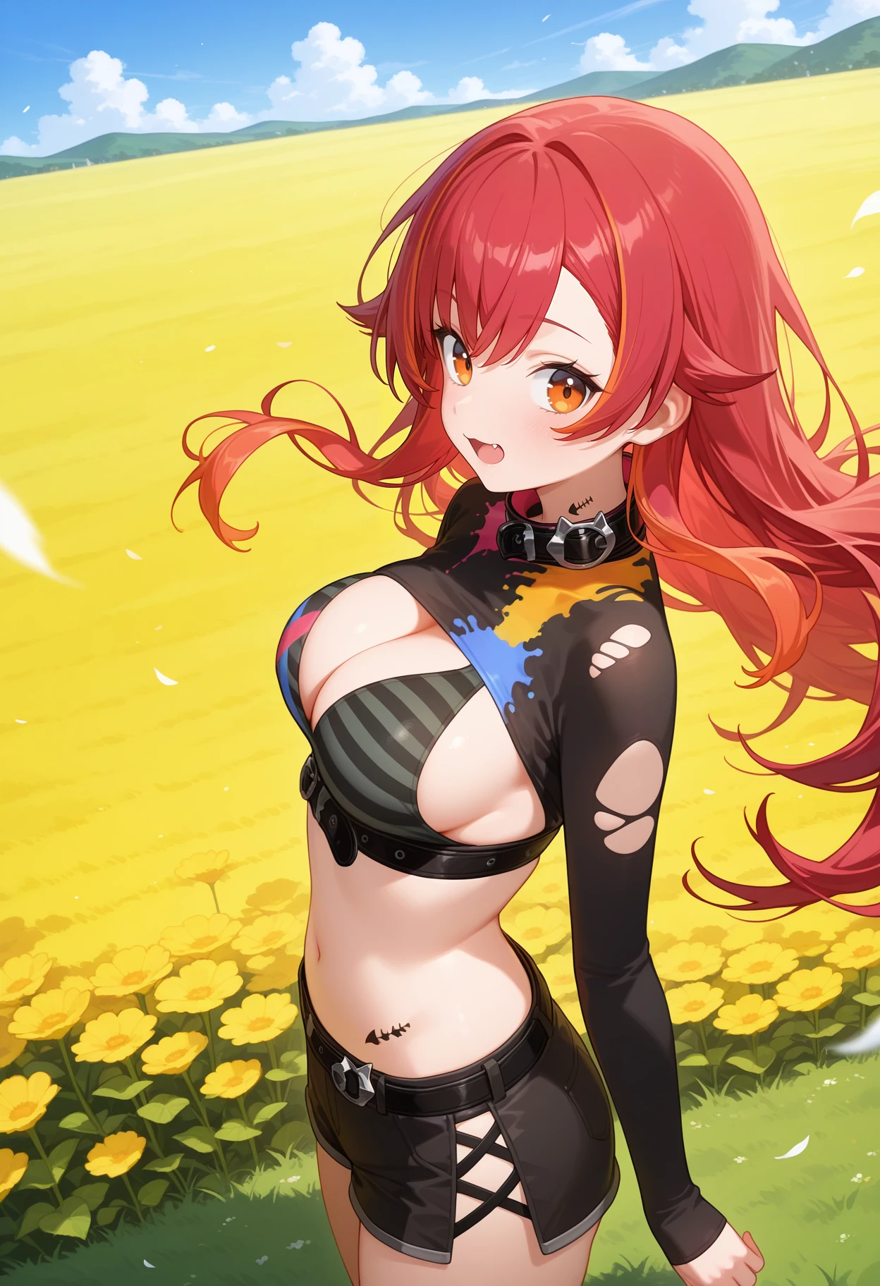 outfit2aatsuna, long hair, multicolored hair, red hair, orange eyes, fang, black collar, cleavage, striped bikini, tight shirt, torn shirt, black shirt, long sleeves, stomach tattoo, midriff, belt, black shorts, side slit