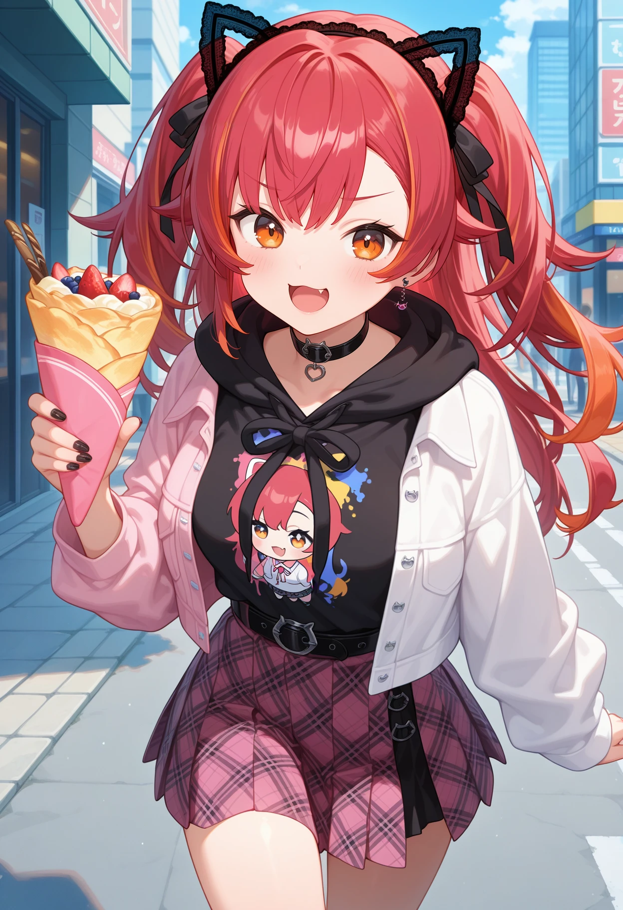 outfit3aatsuna, long hair, multicolored hair, red hair, two side up, hair ribbon, fake animal ears, earrings, orange eyes, fang, black choker, black hoodie, multicolored jacket, white jacket, pink jacket, long sleeves, black belt, plaid skirt