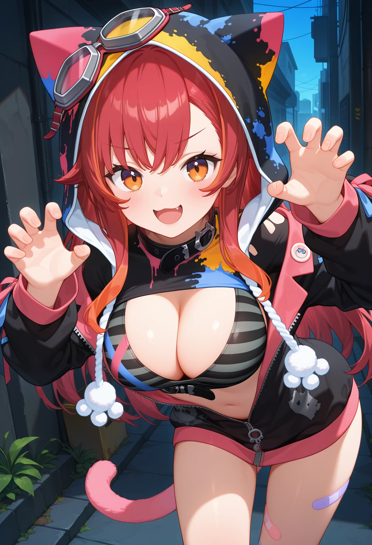 outfit1aatsuna, long hair, multicolored hair, red hair, hood up, animal hood, goggles, orange eyes, fang, tail, black collar, cleavage, striped bikini, torn shirt, black shirt, black jacket, long sleeves, midriff, belt, bandaid on leg