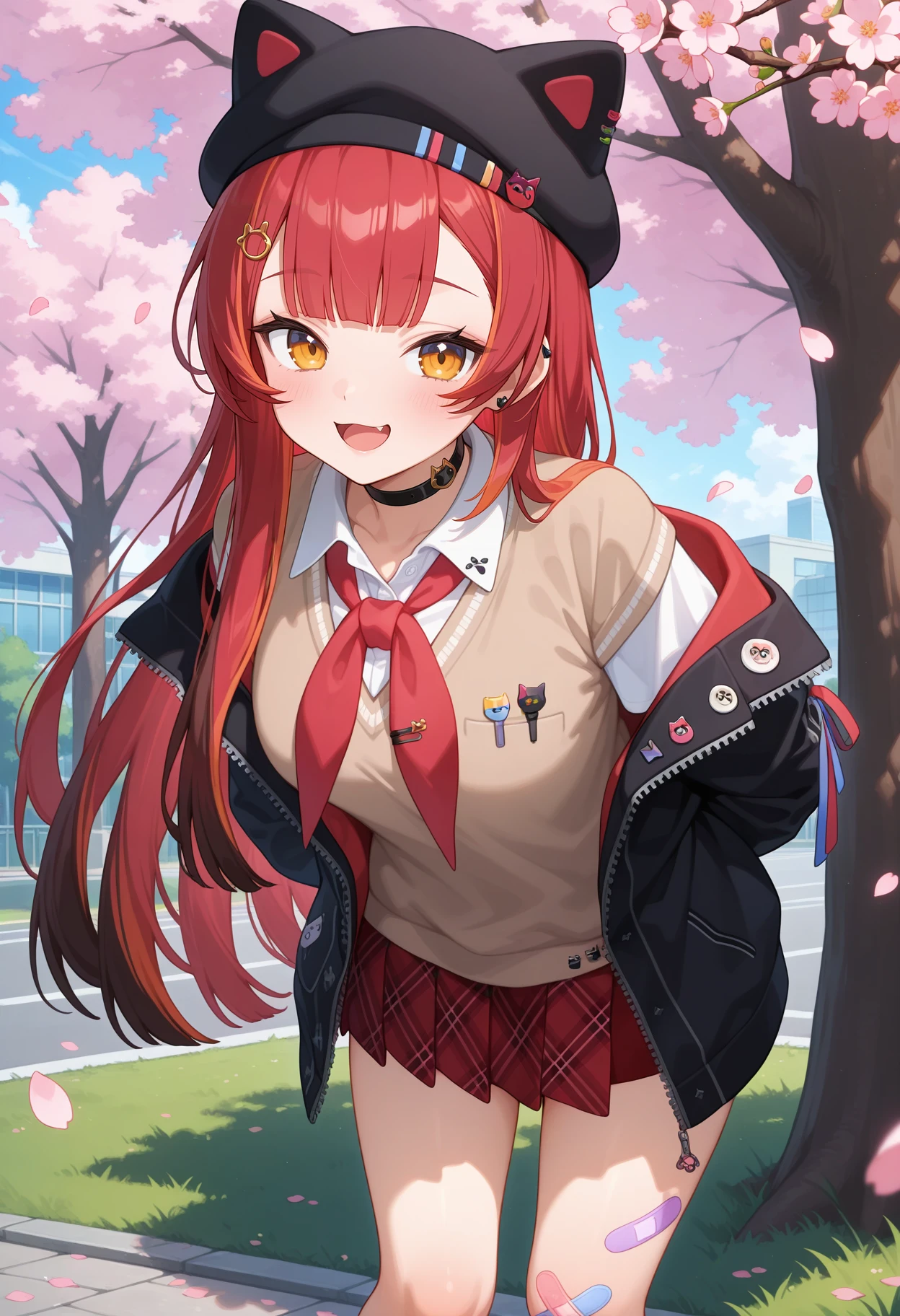 outfit6ddtsuna, long hair, multicolored hair, red hair, animal hat, black headwear, hair ornament, piercing, fang, black choker, school uniform, red neckerchief, collared shirt, white shirt, brown vest, off shoulder, black jacket, long sleeves, plaid skirt, red skirt, bandaid on leg