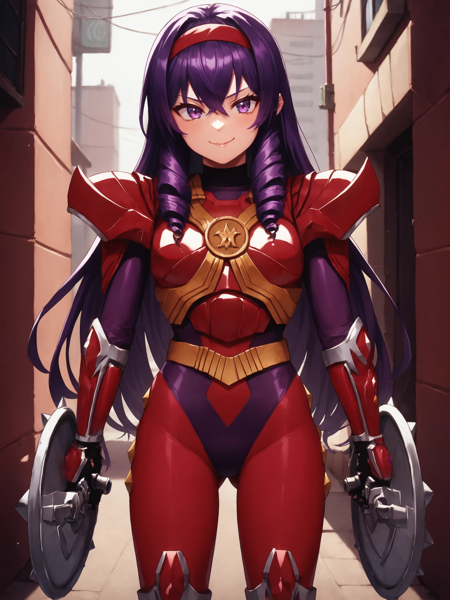 sazervelsou, red bodysuit, purple leotard, belt, armor, gauntlets, black glovesAdd for anime images: