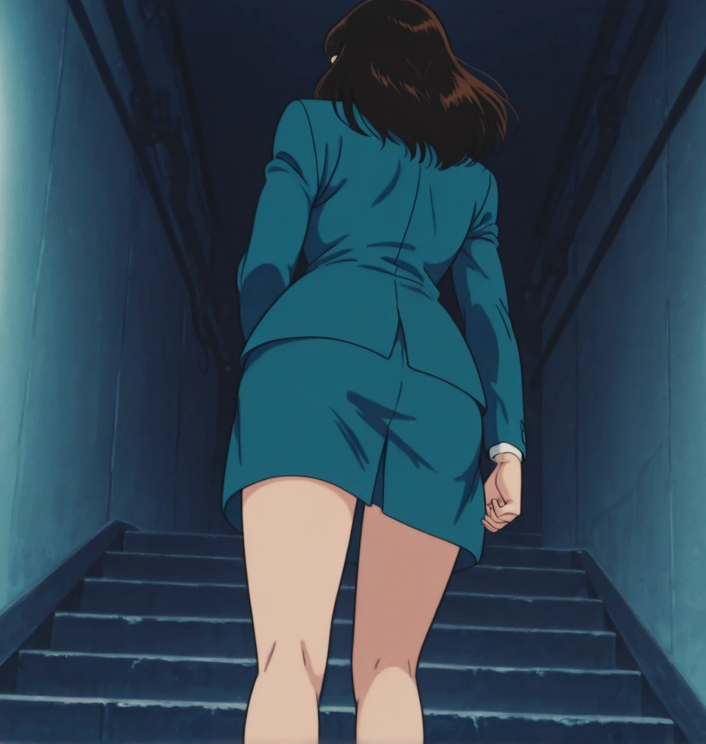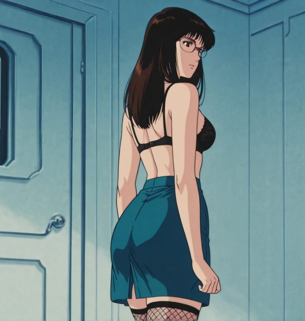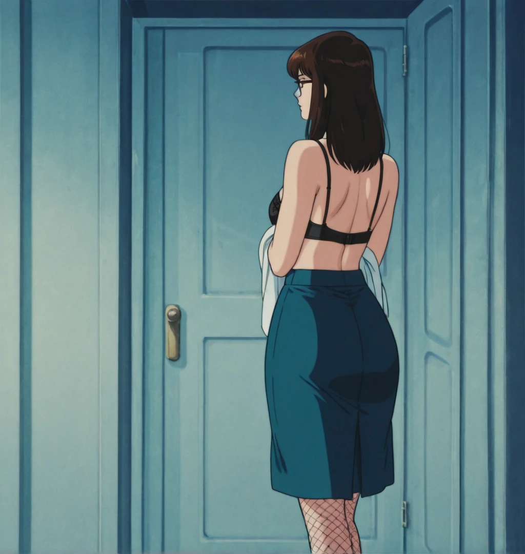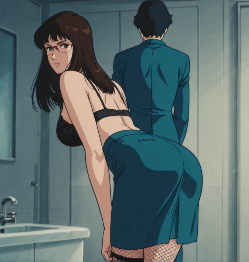 Asatani Mitsuko, Veteran Police Detective, Cat's Eye, Mature Woman, Slim Body, Voluptuous, Sensual Fitness Body, Thin Waist, Wide Hips, Glasses, Brown Eyes, Straight Hair, Brown Hair, Long Hair, Shoulder-Length Hair, White Skin, Full Lips, Office Lady, Anime Screenshot, Official Art Style, Expressive Face, Elegant Woman