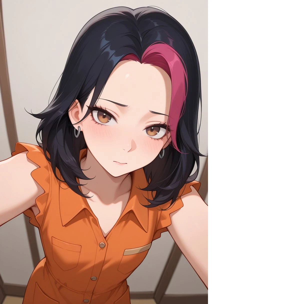 gina01,orange_dress,colored hair,black hair,brown eyes,medium hair,ear rings