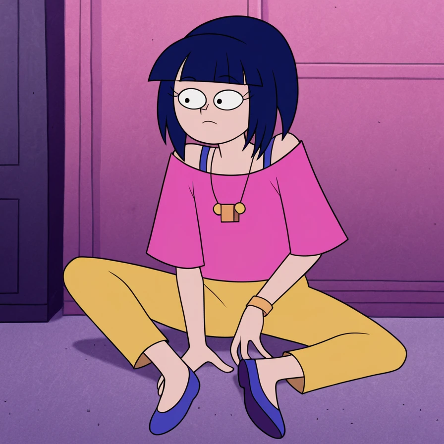 1girl, solo, short hair, blue hair, bangs, jewelry, necklace, style parody, shoulder, yellow pants, shoes