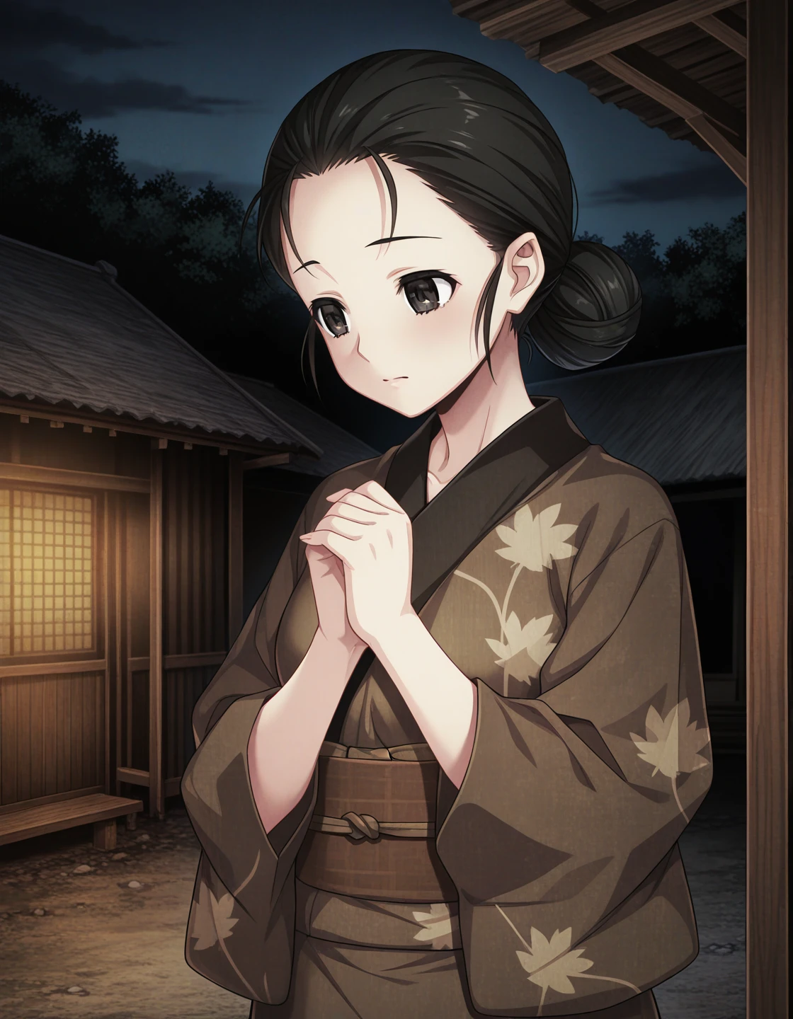 sae_Erewhon, black hair, single hair bun, black eyes, forehead, brown kimono, print kimono
