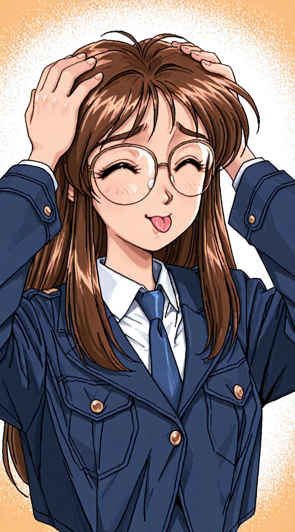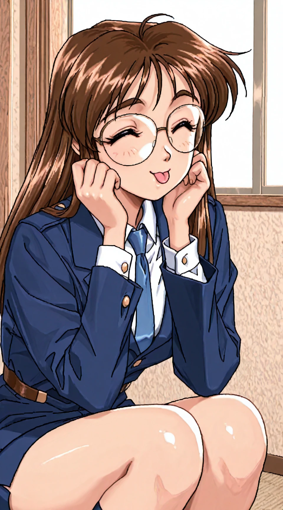 nikaido_yoriko, long_sleeves, glasses, white_collared_shirt, blue_jacket, blue_necktie
