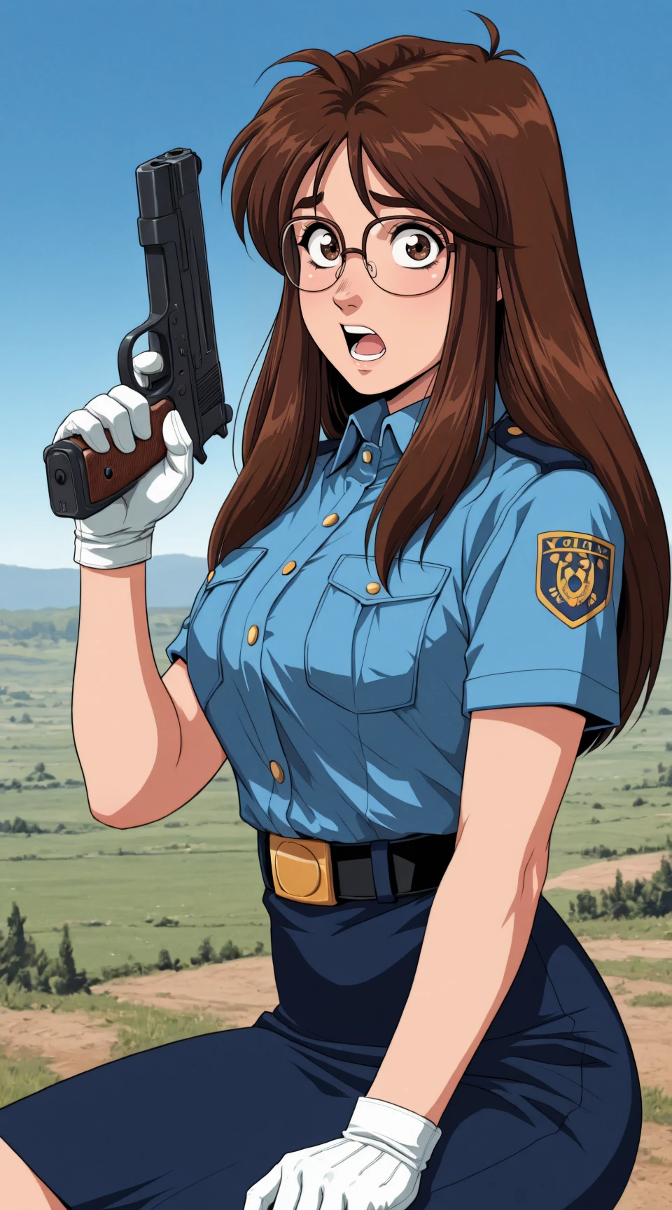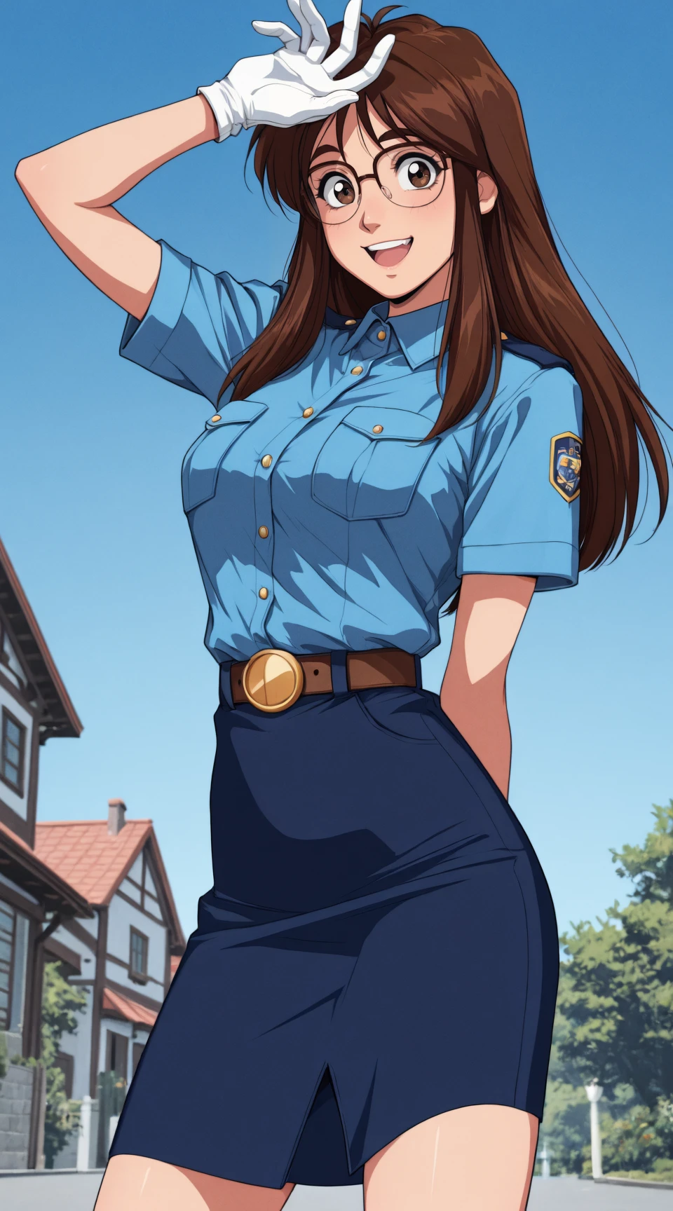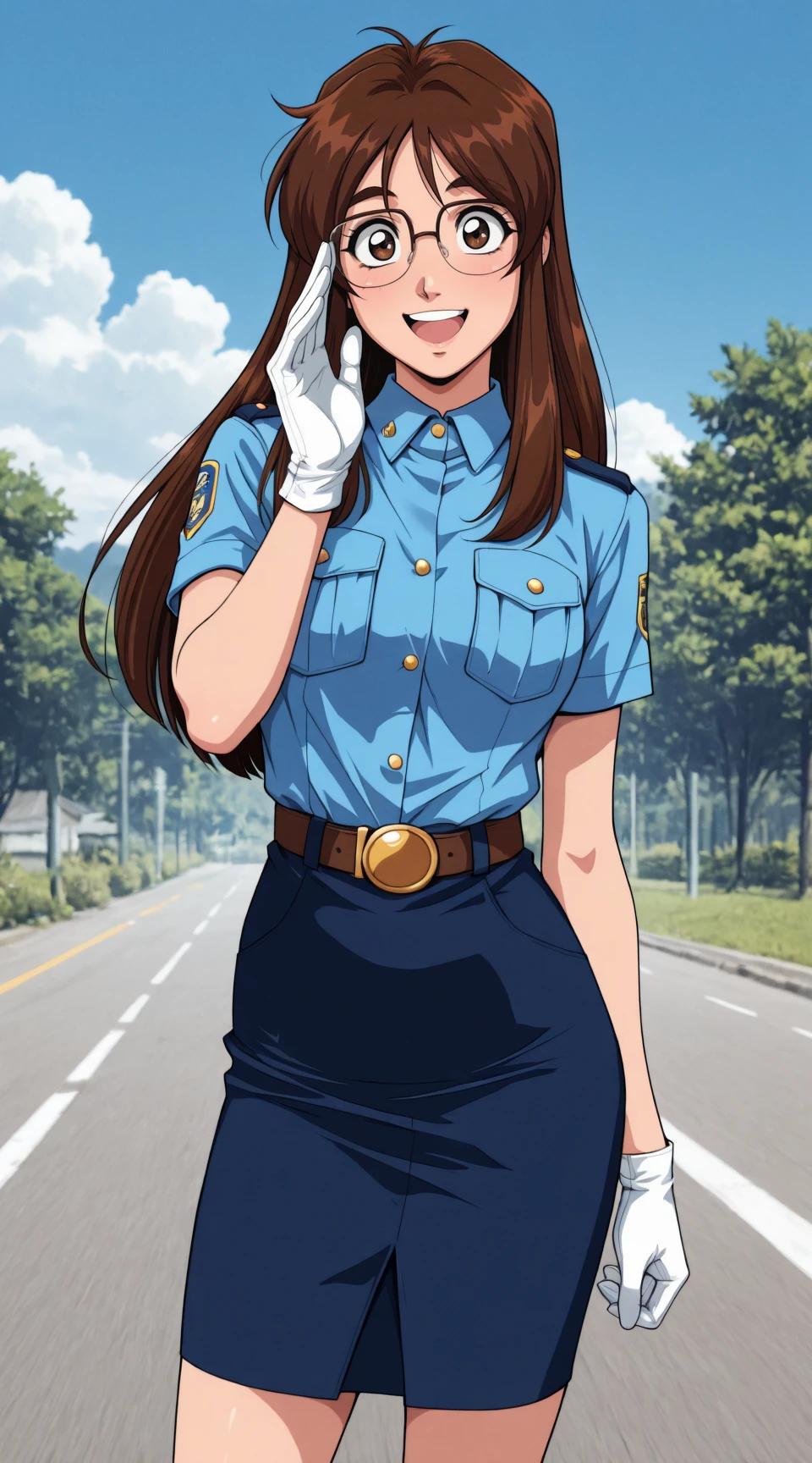 nikaido_yoriko, short_sleeves, glasses, white_gloves, blue_collared_shirt, blue_pencil_skirt, belt