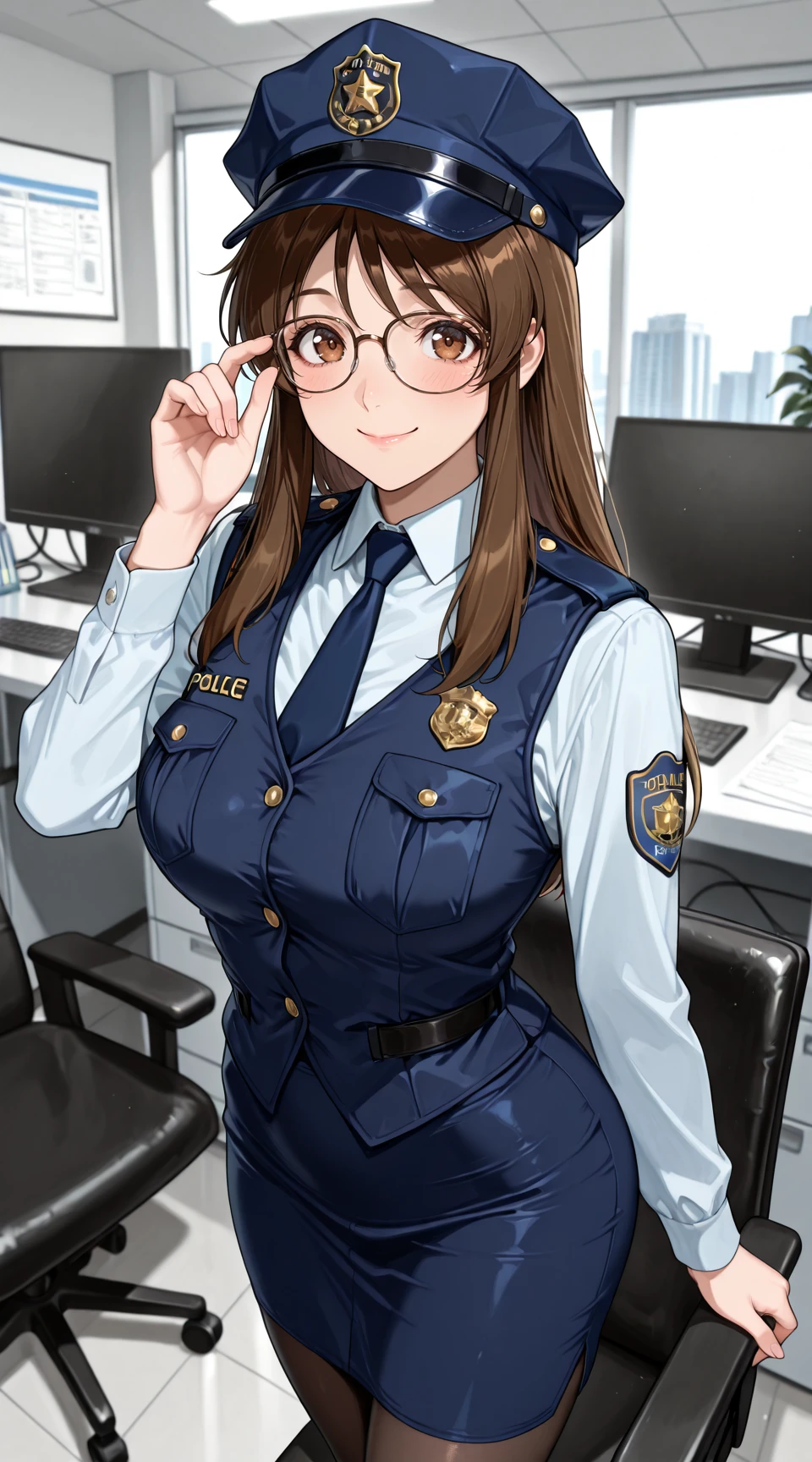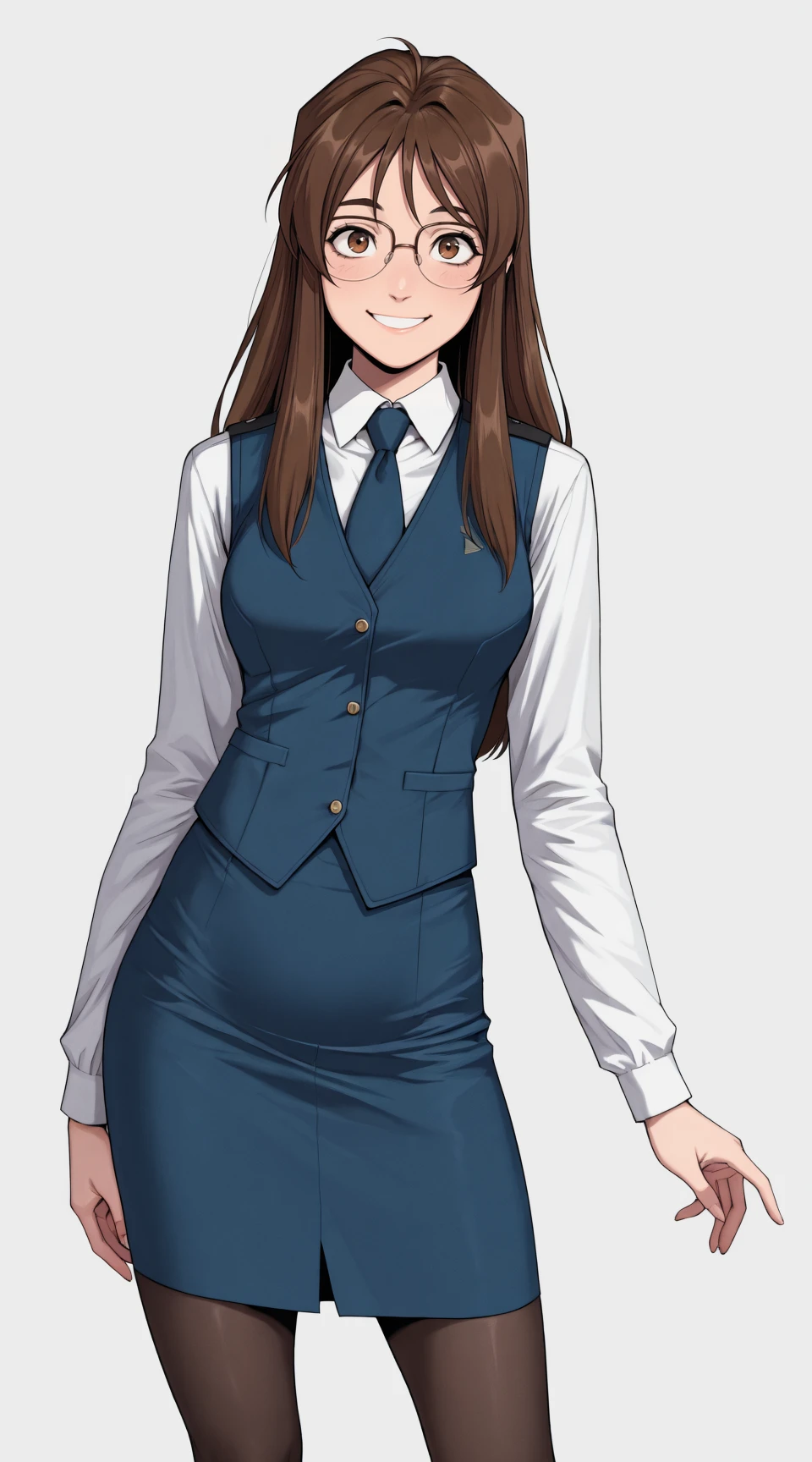 nikaido_yoriko, long_sleeves, pantyhose, glasses, white_collared_shirt, blue_vest, blue_necktie, blue_pencil_skirt