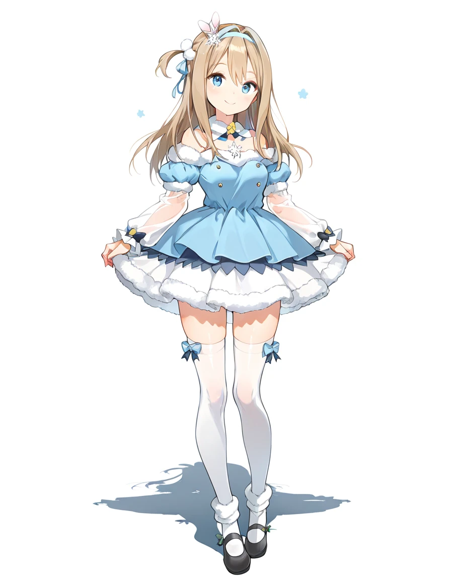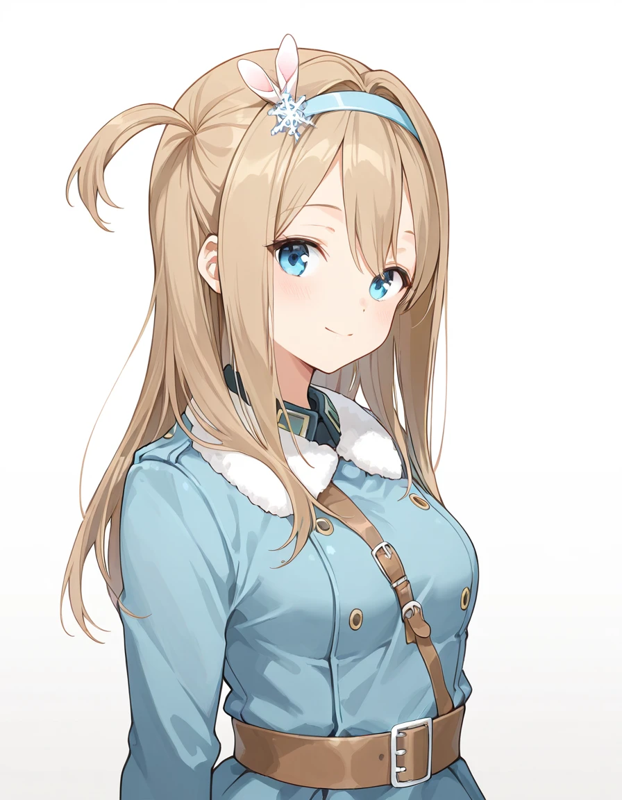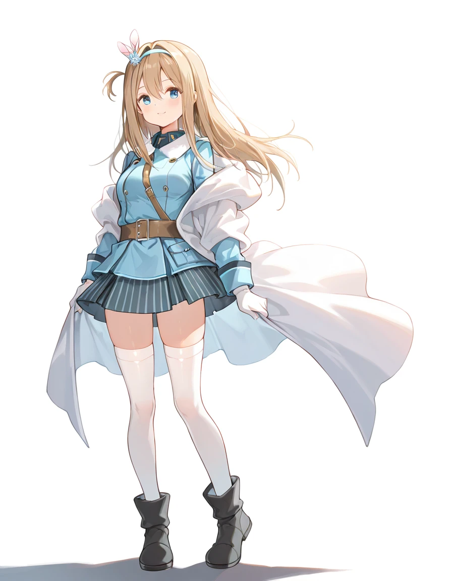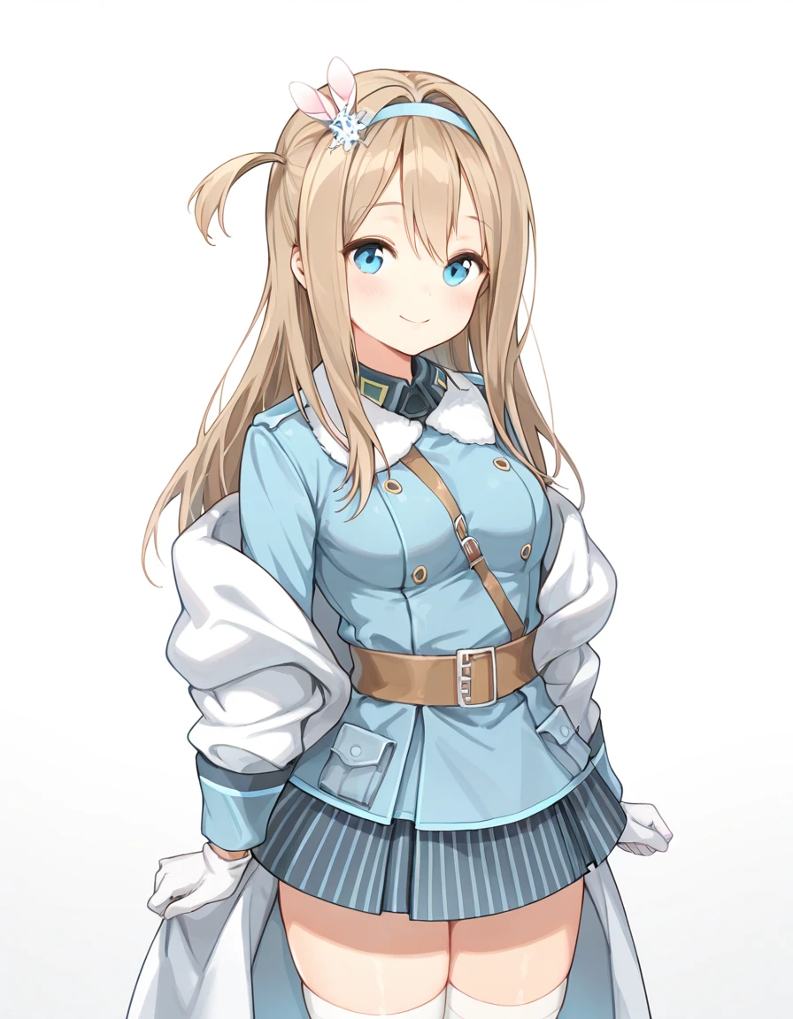 Suomidef, light brown hair, blue eyes, def_jacket, shoulder belt, def_coat, open coat, def_gloves, suomi_hairband, def_skirt, def_thighhighs, def_boots, fur collar, suomi_bunny_hair_ornament, suomi_snowflake_hair_ornamentMidsummer Pixie (summer):