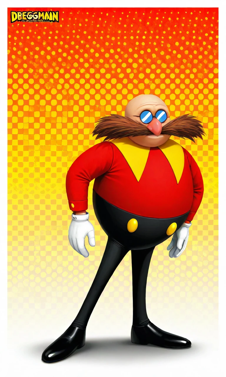 ClassicDrEggman, 1boy, round body, red shirt, yellow short cape, black pants, black shoes, bald head, bushy mahogany brown mustache, blue glasses, white gloves, fat, chubby, round, distinct pinkish nose, short, cartoonish