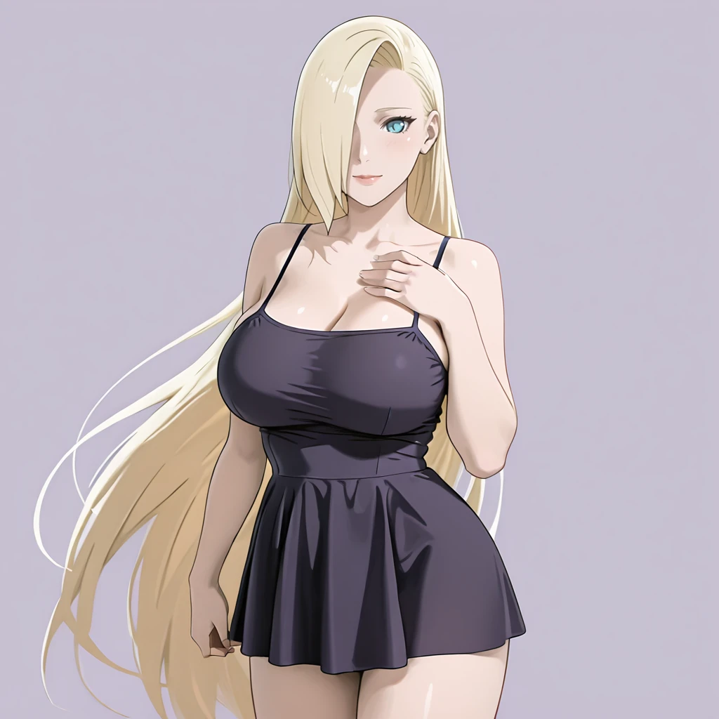 Trigger with boruto outfit: InoLongHairShipuuden, 1girl, midriff, blonde hair, hair over one eye, large breasts, fishnets, blue eyes, crop top, bare shoulders, navel, skirt, groin, cowboy shot
