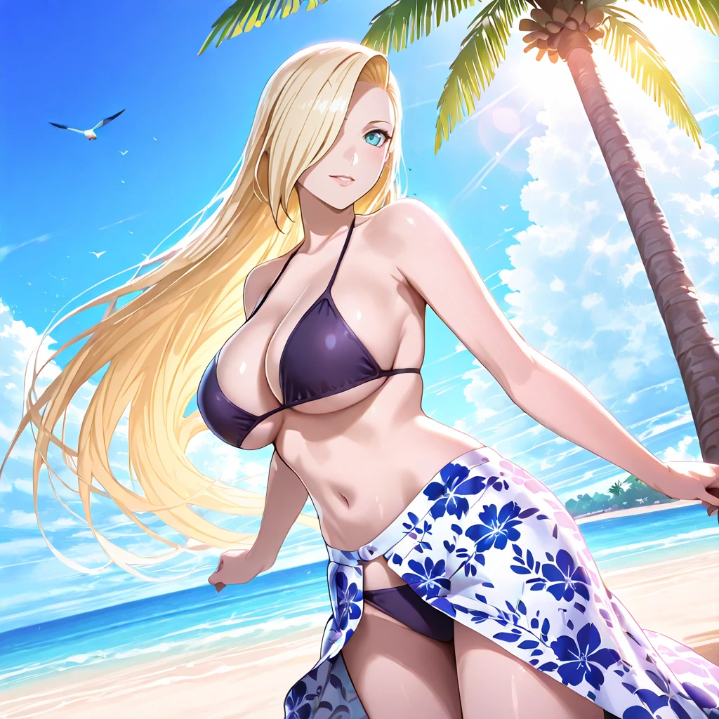 Trigger : InoShipuuden, 1girl, solo, blonde hair, high ponytail, hair over one eye, midriff, navel, purple skirt, fishnets, crop top, breasts, blue eyes, bare shoulders, cowboy shot