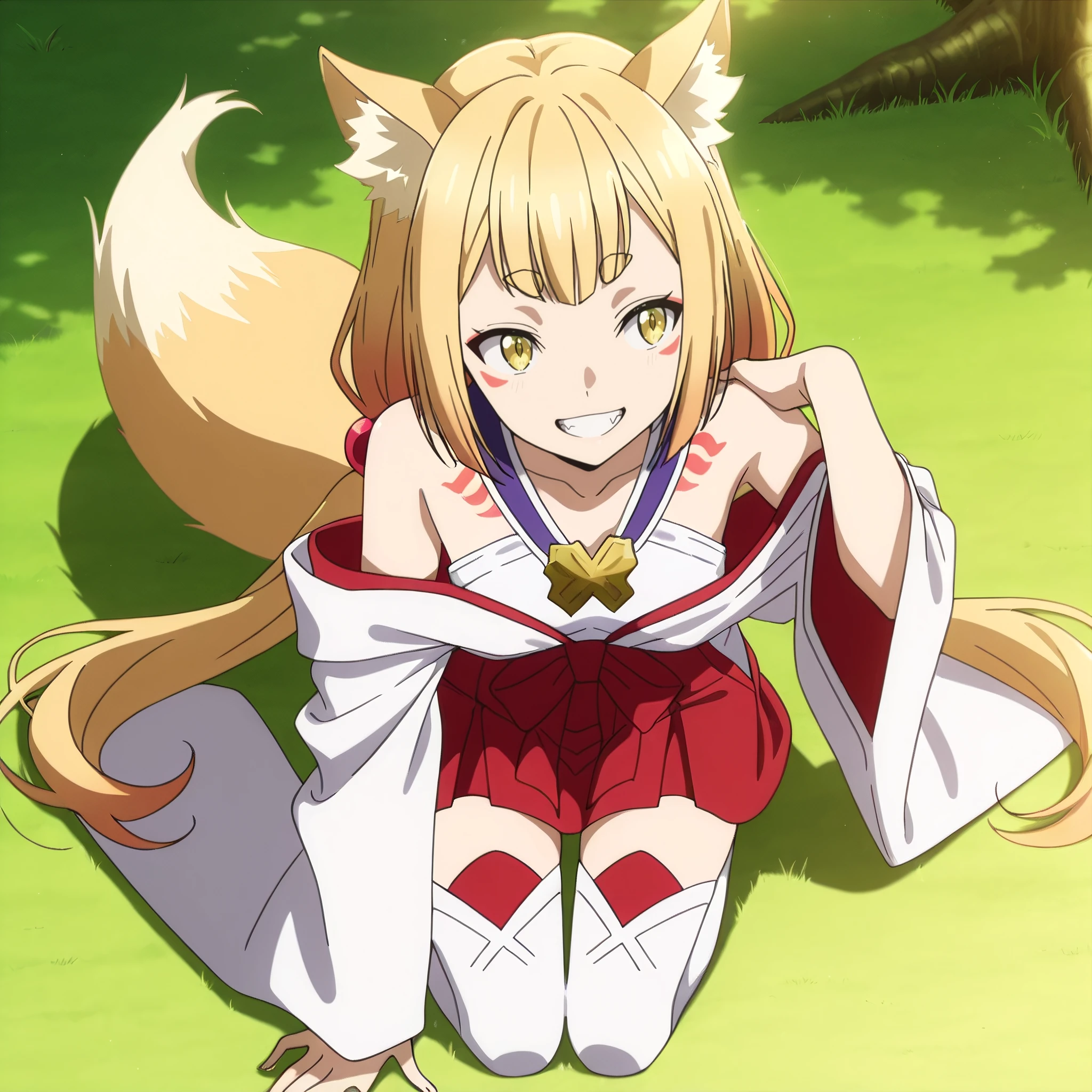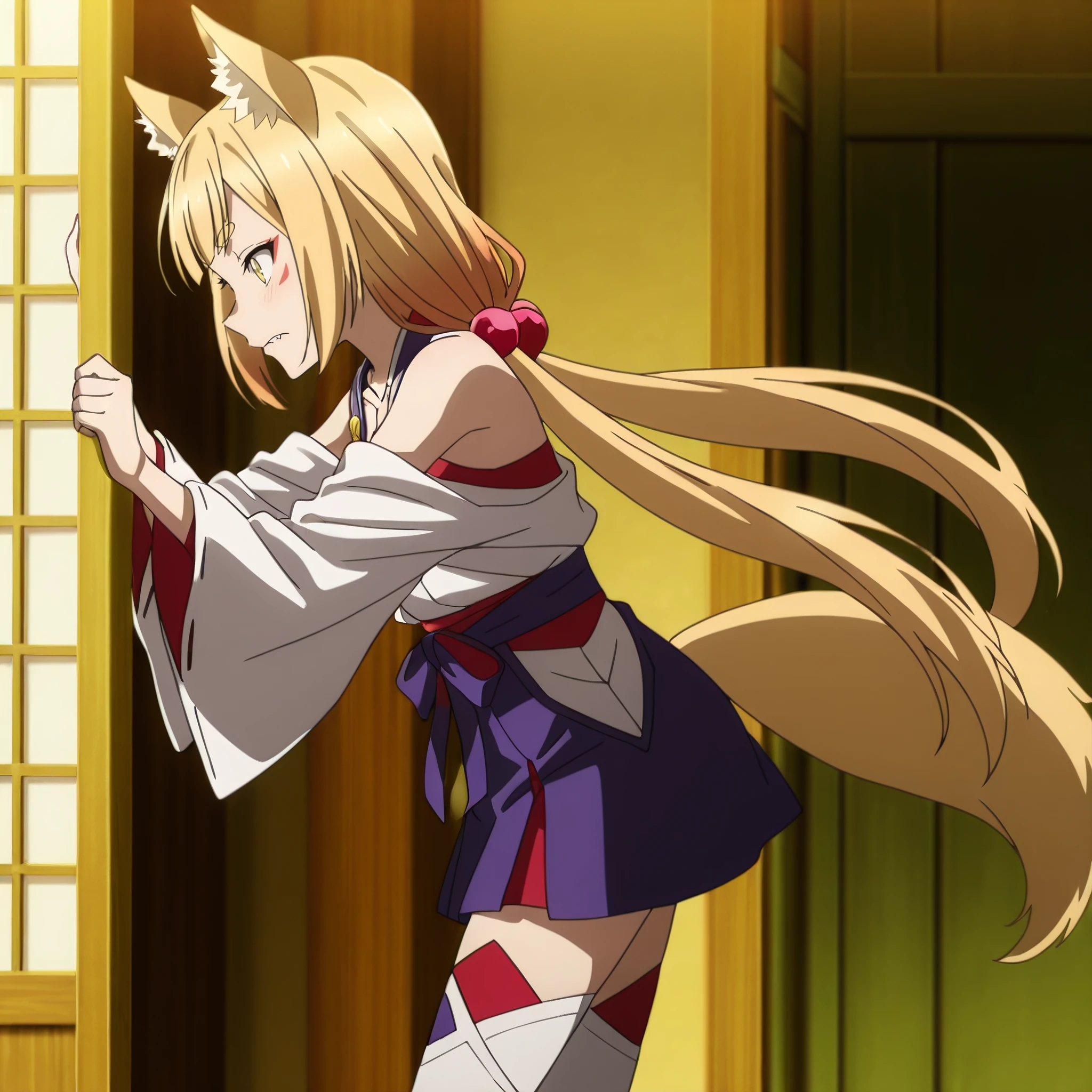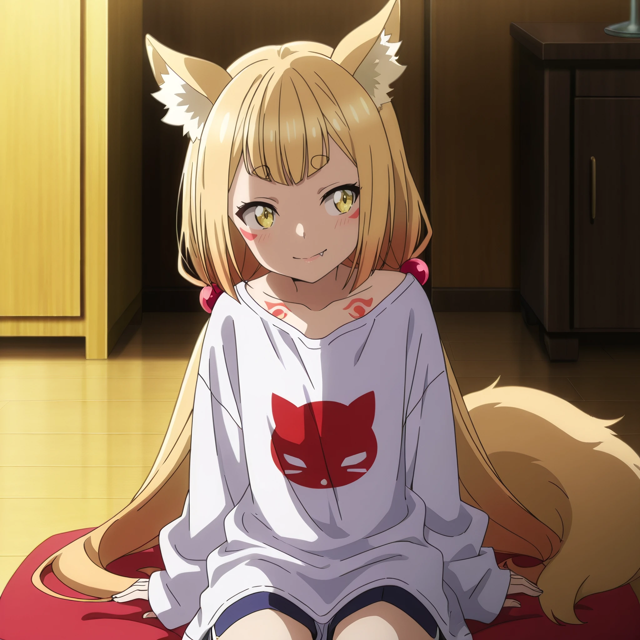 SRALowen, animal ears, fox ears, very long hair, yellow eyes, blonde hair, animal ear fluff, fang, tattoo, fox girl, facial mark, low twintails, short eyebrows, hair ornament, hair bobbles, fox tail,