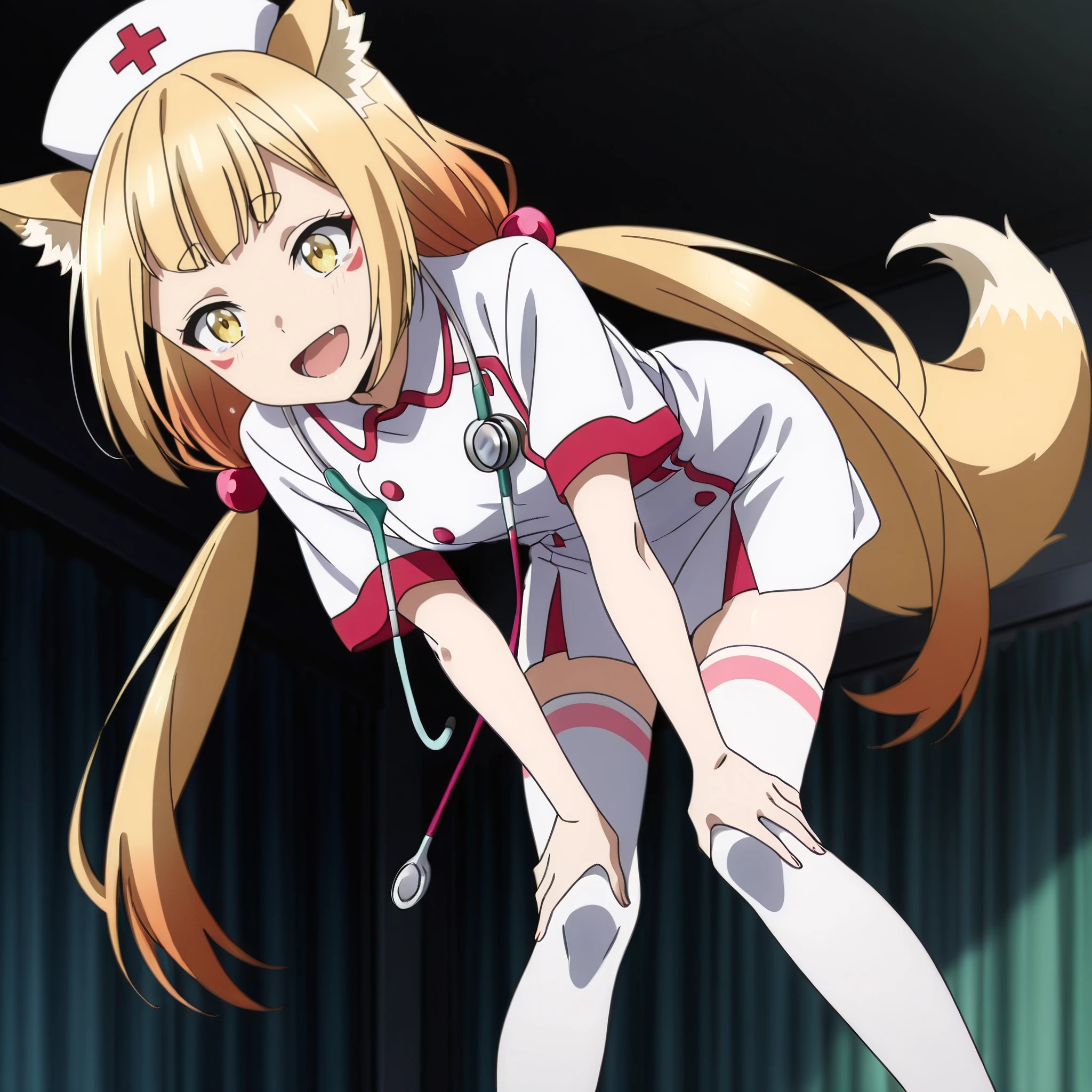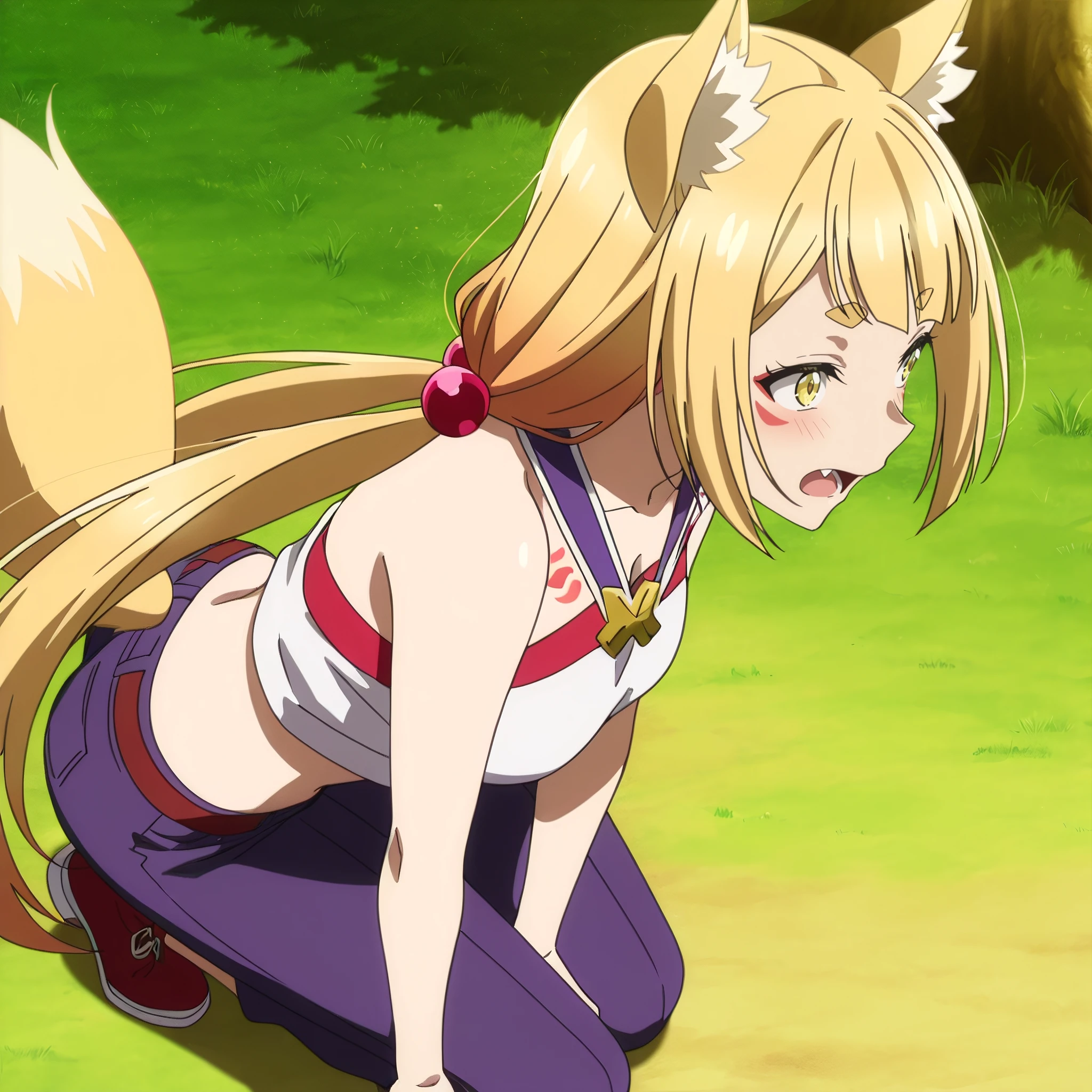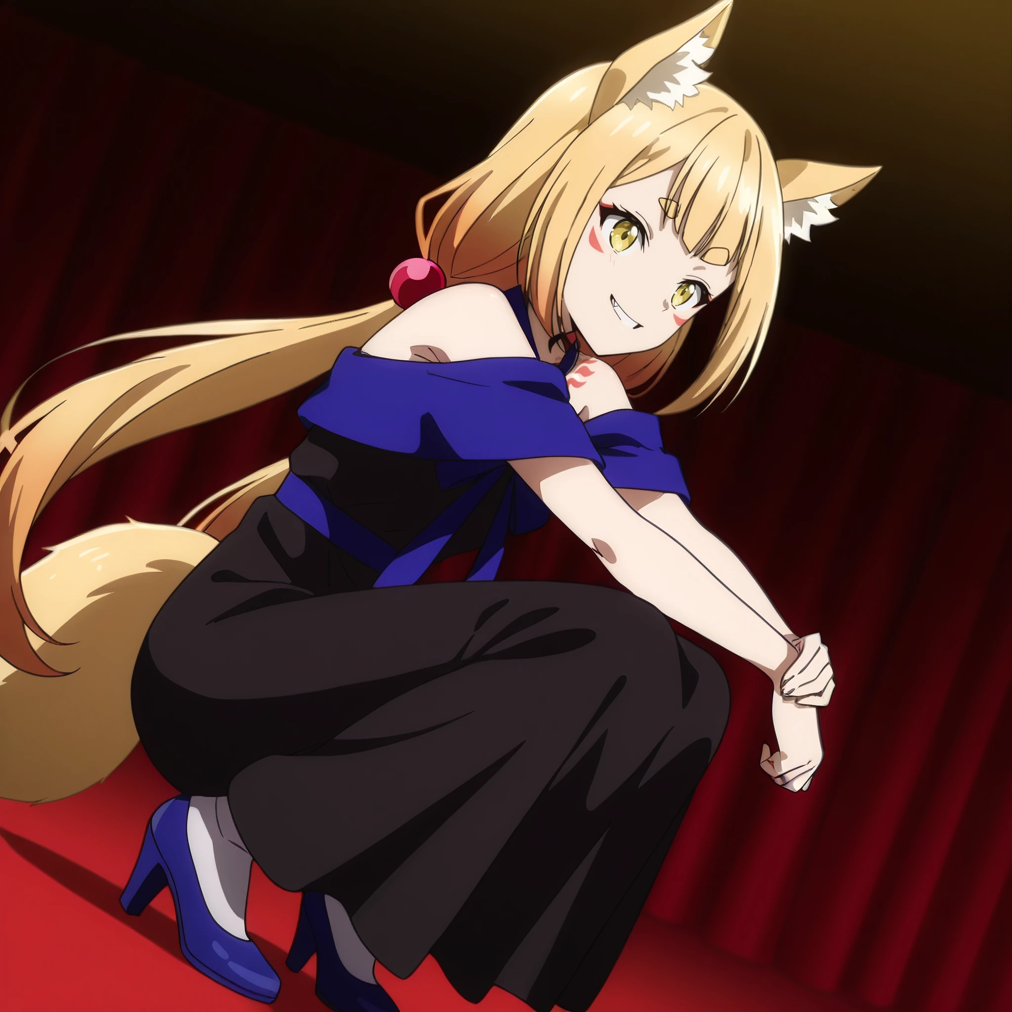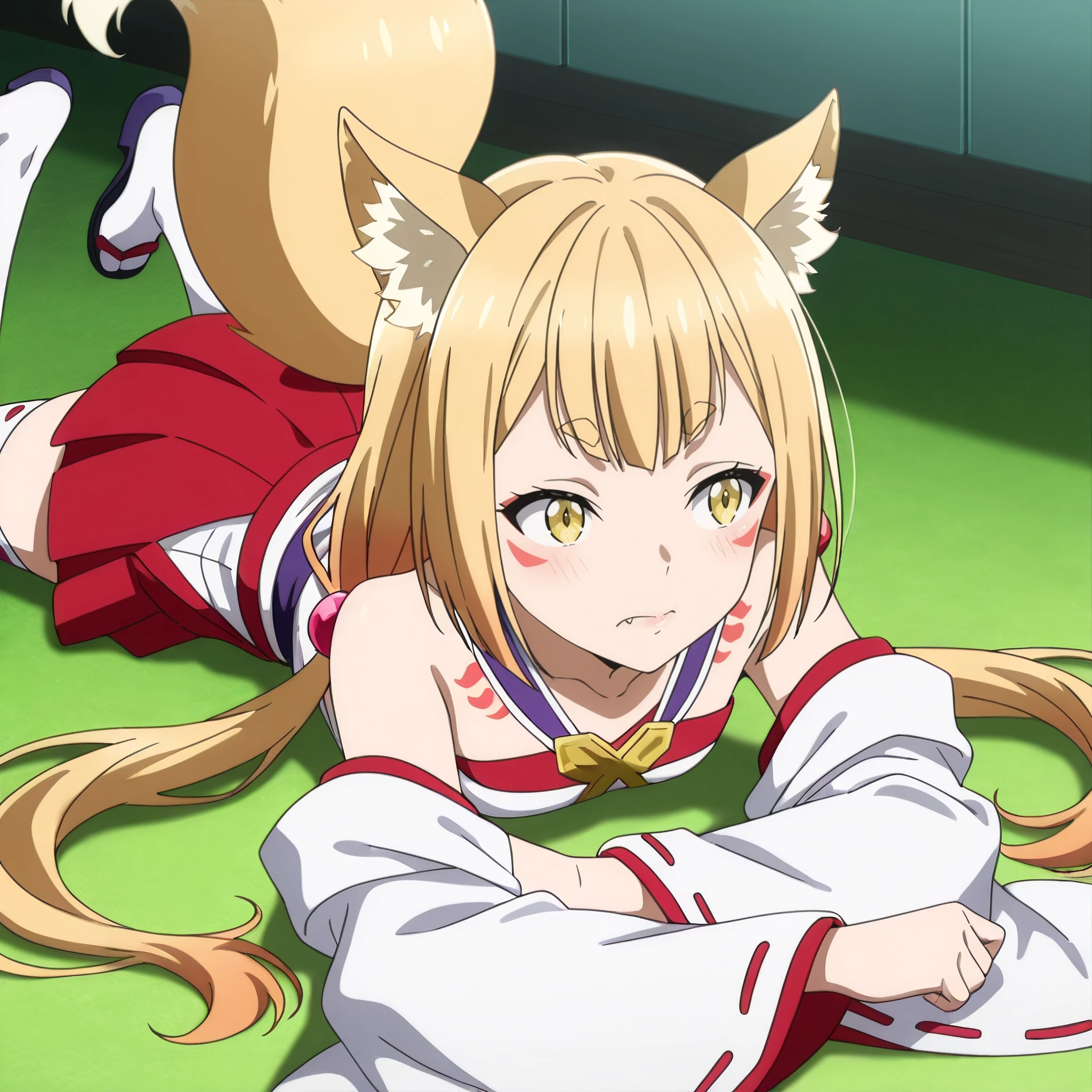 SRALowen, animal ears, fox ears, very long hair, yellow eyes, blonde hair, animal ear fluff, fang, tattoo, fox girl, facial mark, low twintails, short eyebrows, hair ornament, hair bobbles, fox tail,