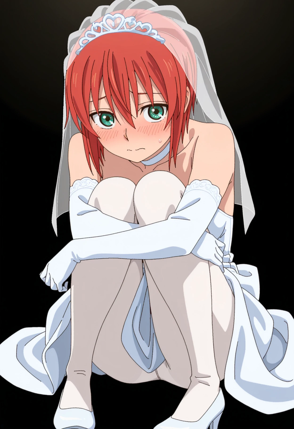 wedding dress, veil, bare shoulders, elbow gloves, white pantyhose