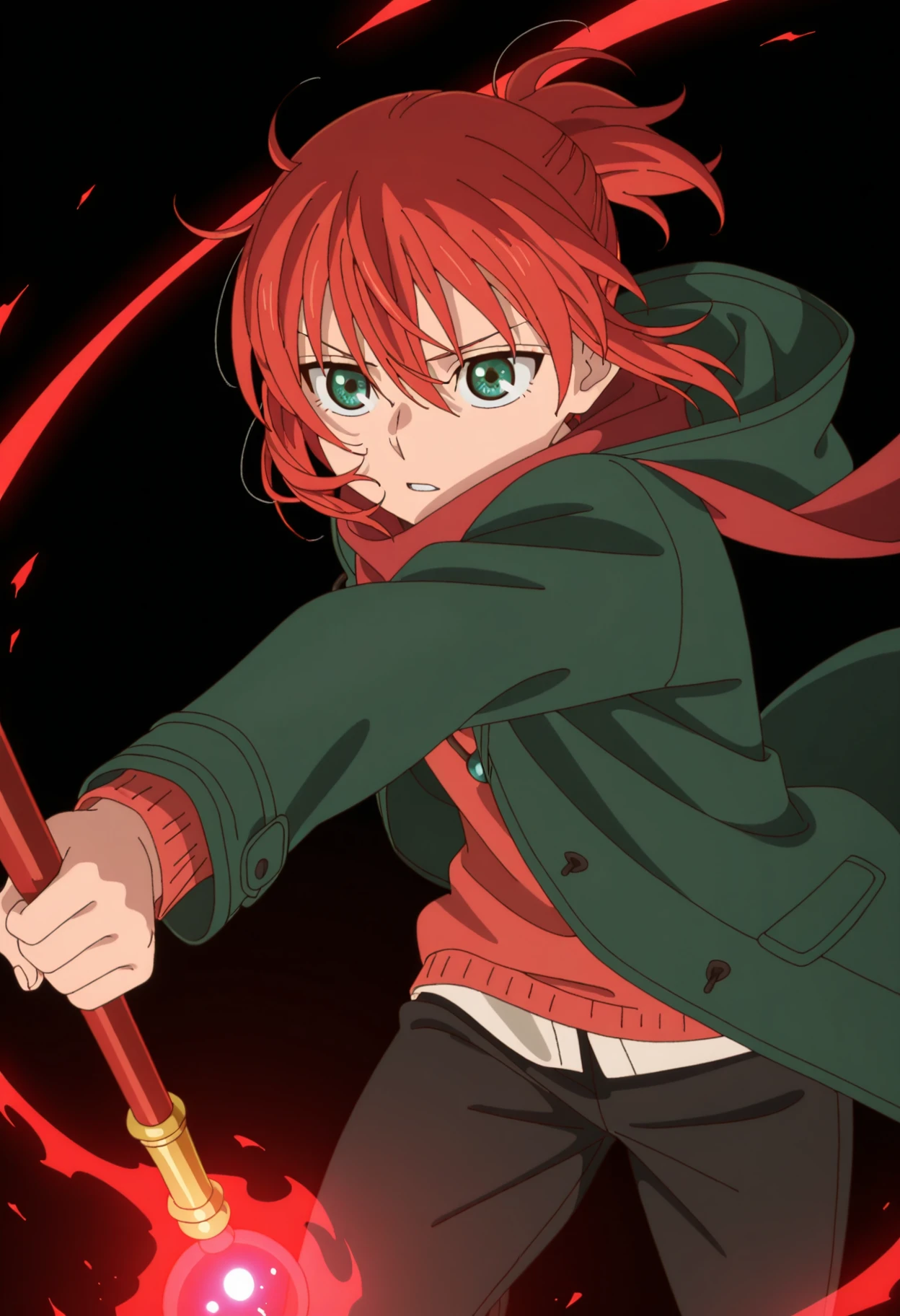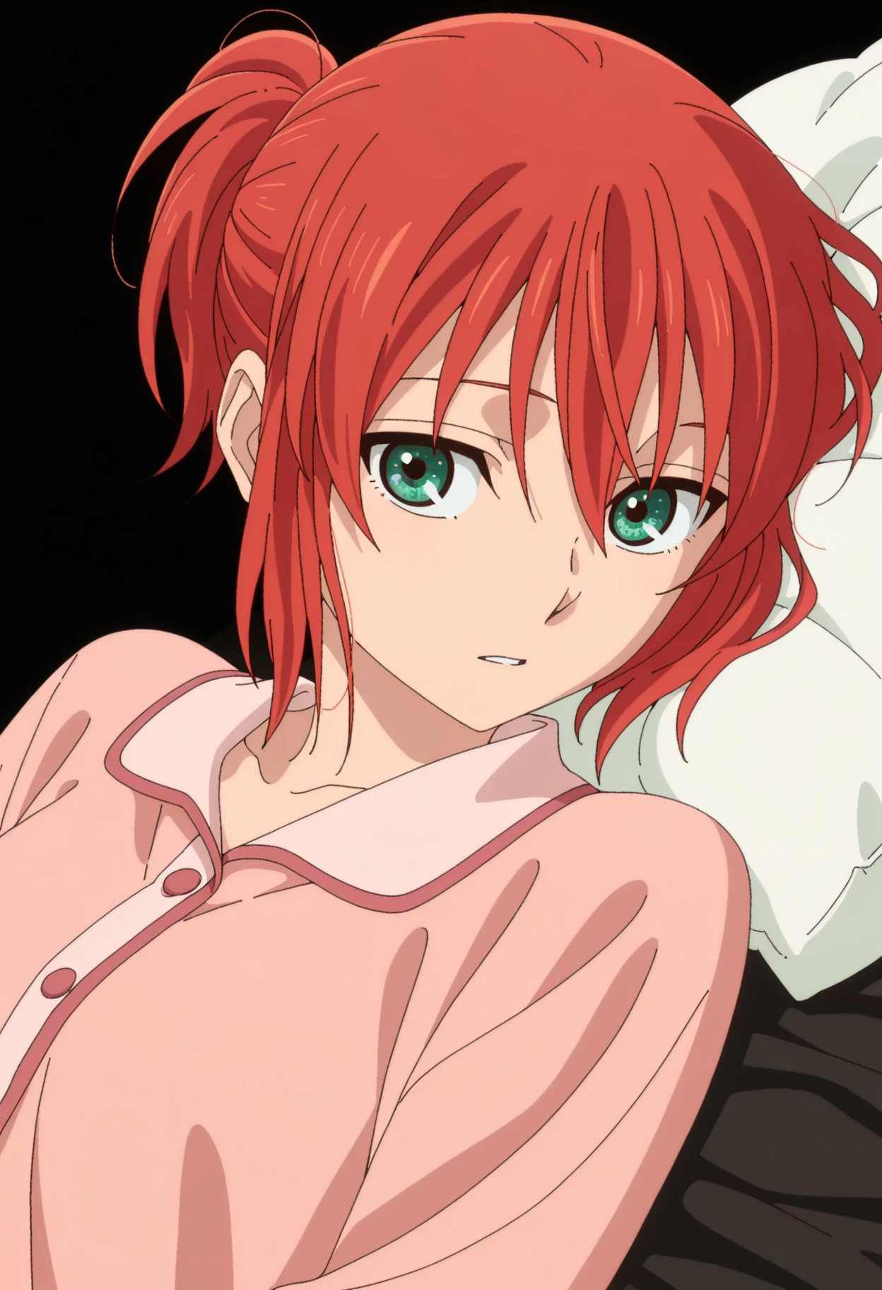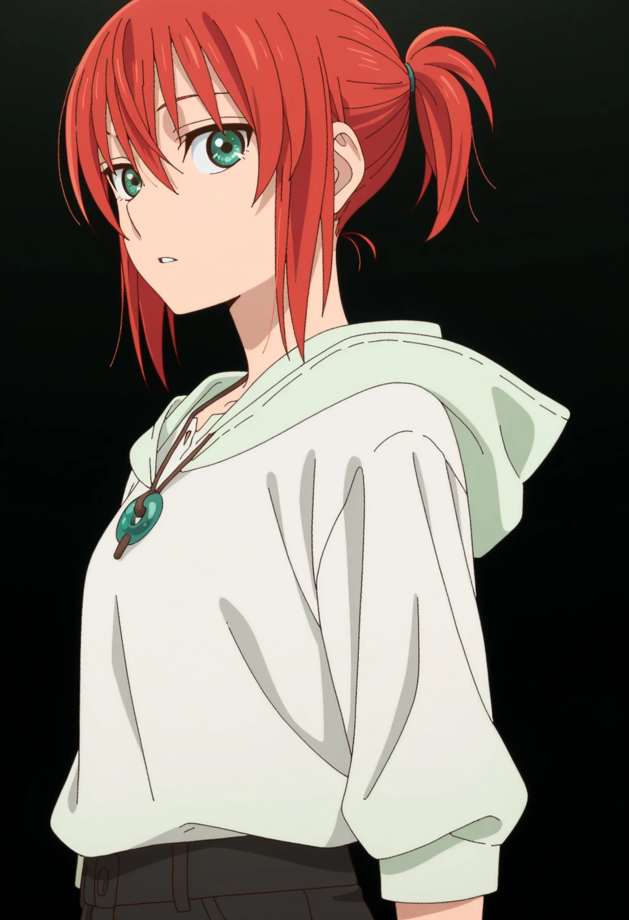 1girl, solo, chise hatori, red hair, green eyes, short hair, hair between eyes, ponytail