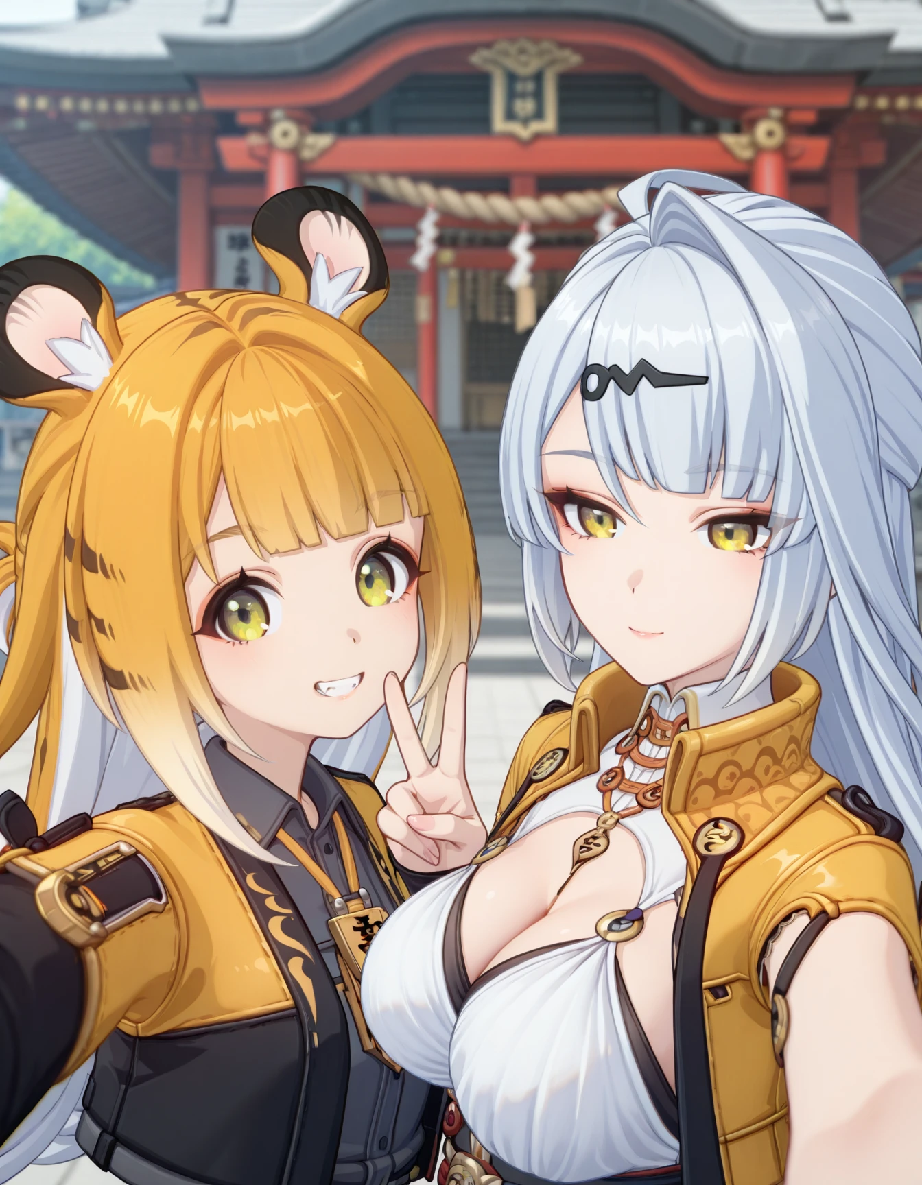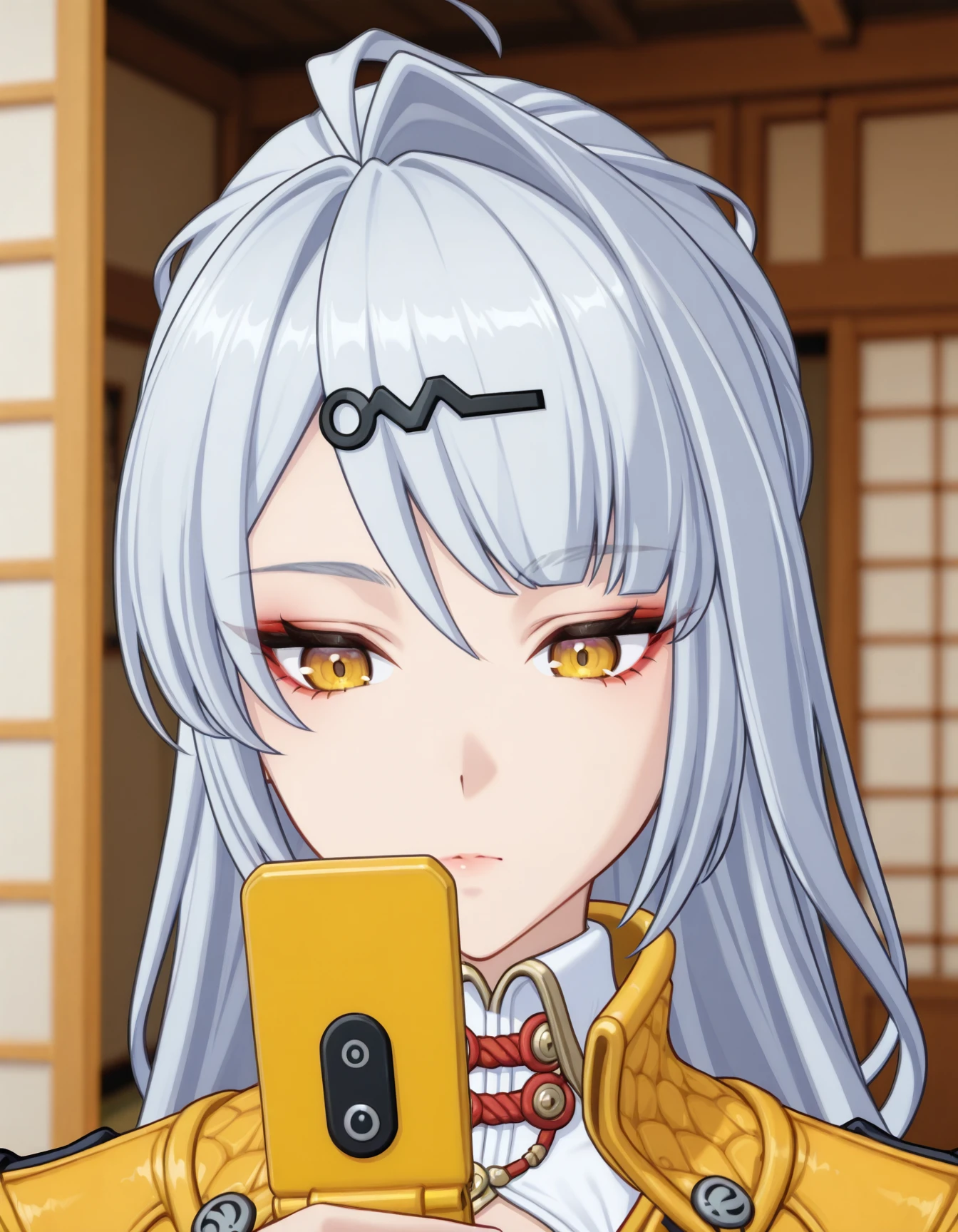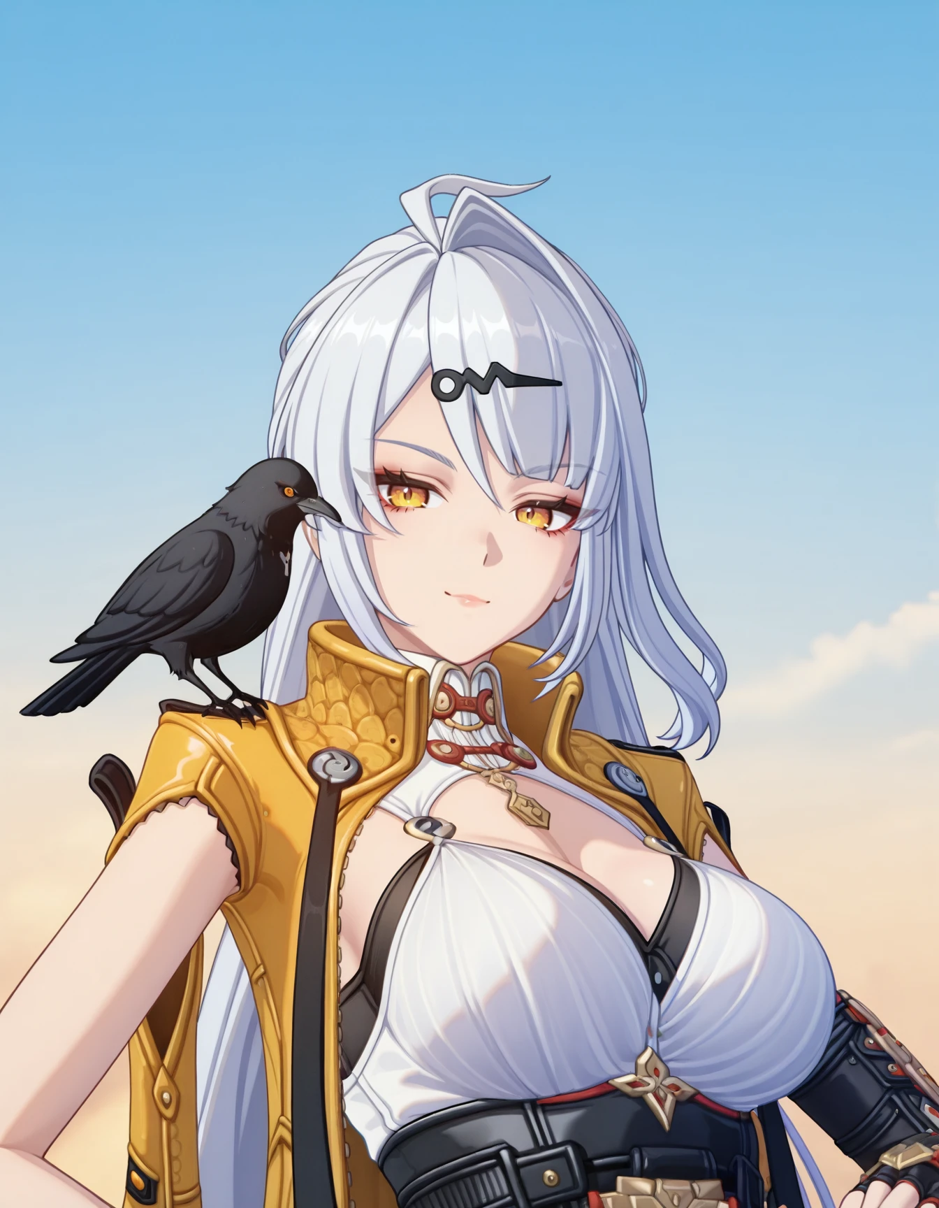 Can unreliably remove jacket with y1yu4n, (grey hair:0.4), hairclip, white bra, white shirt, sleeveless shirt, bare shoulders, cleavage cutout, high-waist shorts, belt, single thighhigh, thigh strap, fingerless gloves, single elbow glove