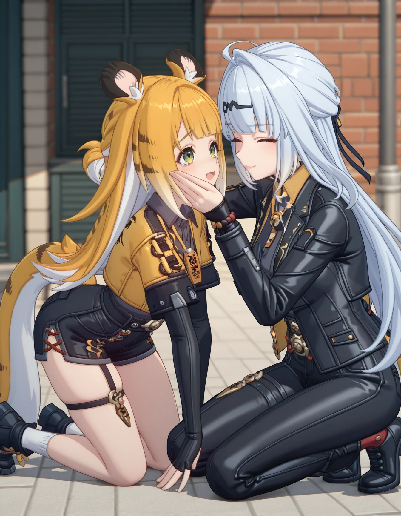 jufufu, tiger ears, cropped jacket, open jacket, collared shirt, high-waist shorts, elbow gloves, fingerless gloves, tiger tail