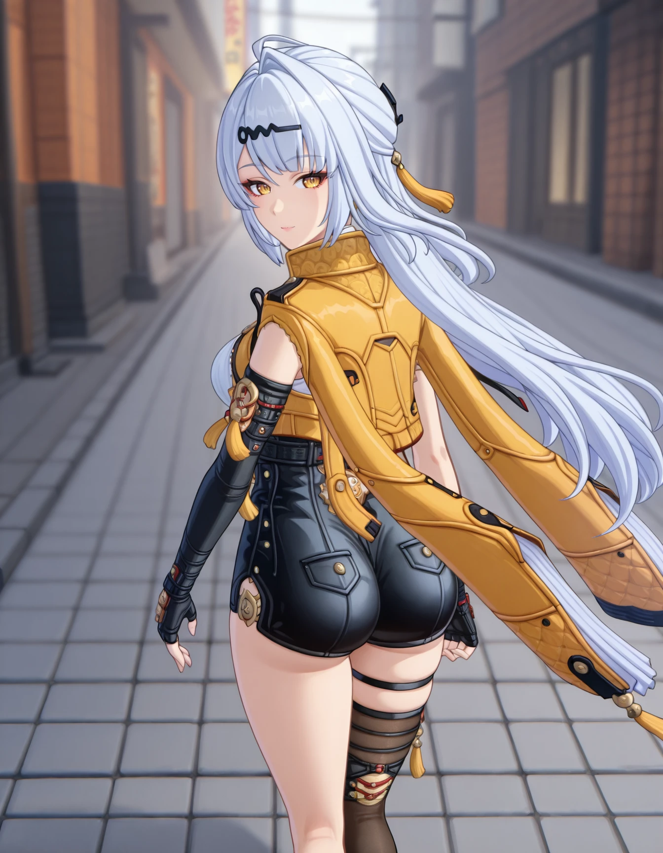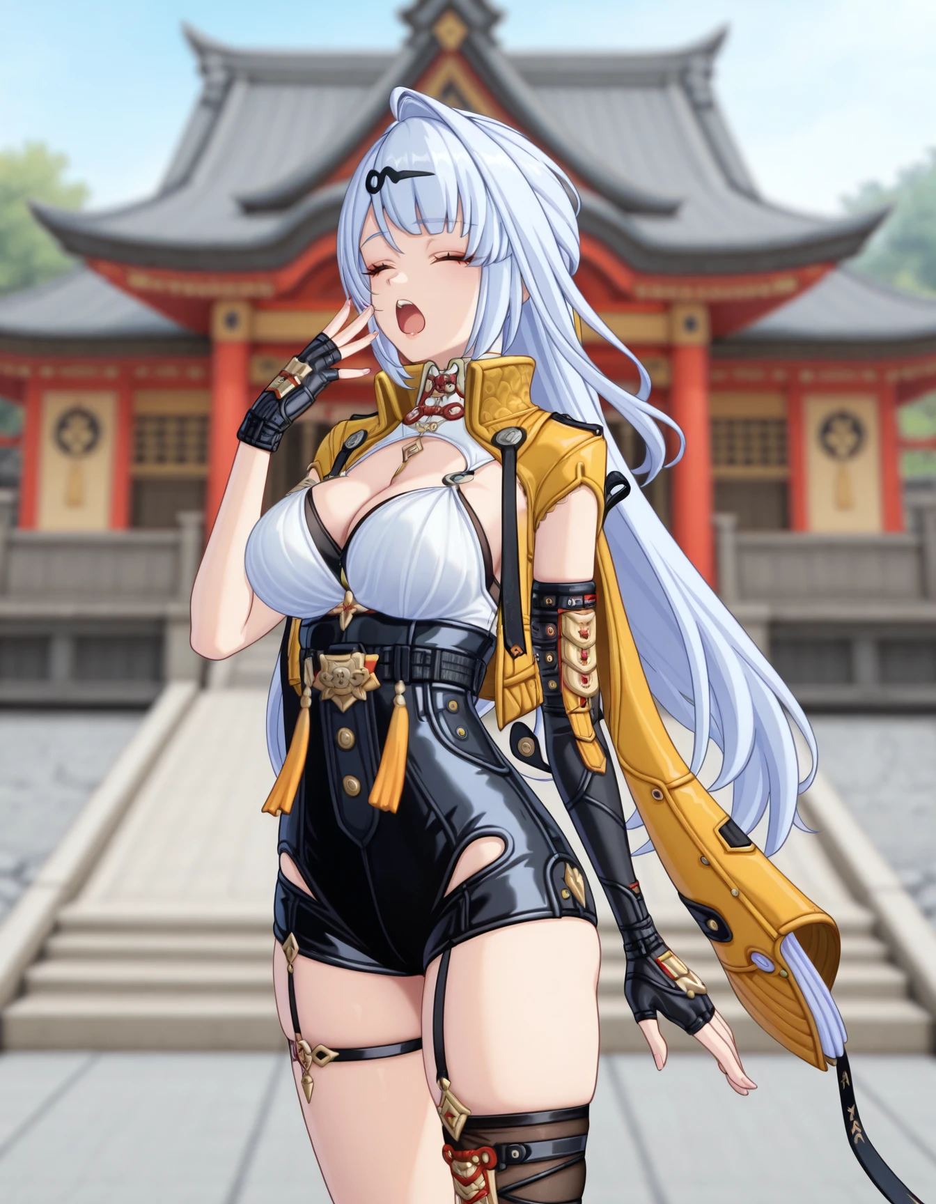 y1yu4n, (grey hair:0.4), jacket on shoulders, white shirt, cleavage cutout, high-waist shorts, belt, single thighhigh, thigh strap, fingerless gloves, single elbow glove