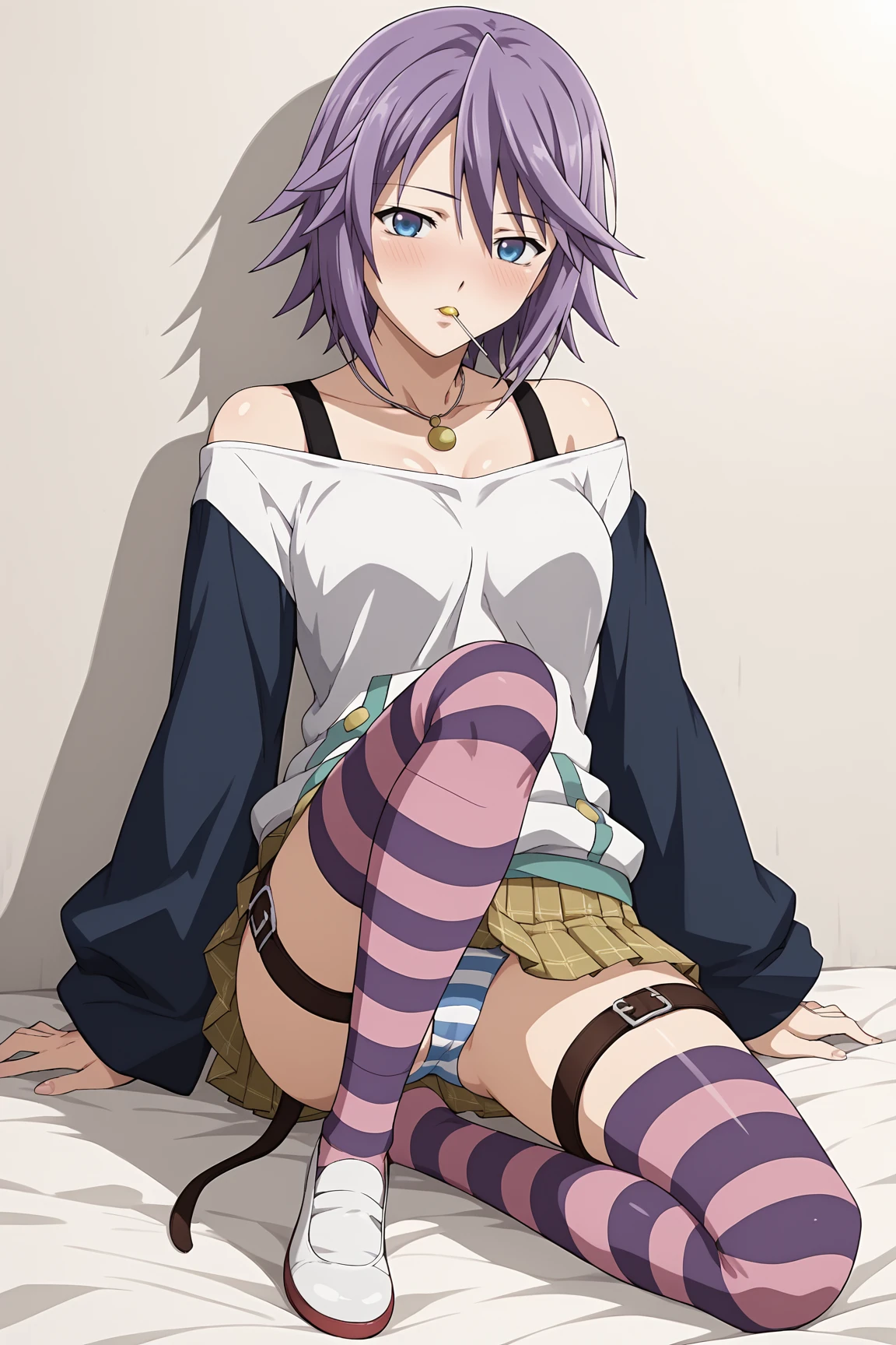 1girl, shirayuki mizore, rosario+vampire, short hair, purple hair, blue eyes, medium breasts, mizoreoutfit, long sleeves, striped thighhighs, pleated skirt, necklace, lollipop, one leg belt, striped panties, anime coloring, anime screencap,