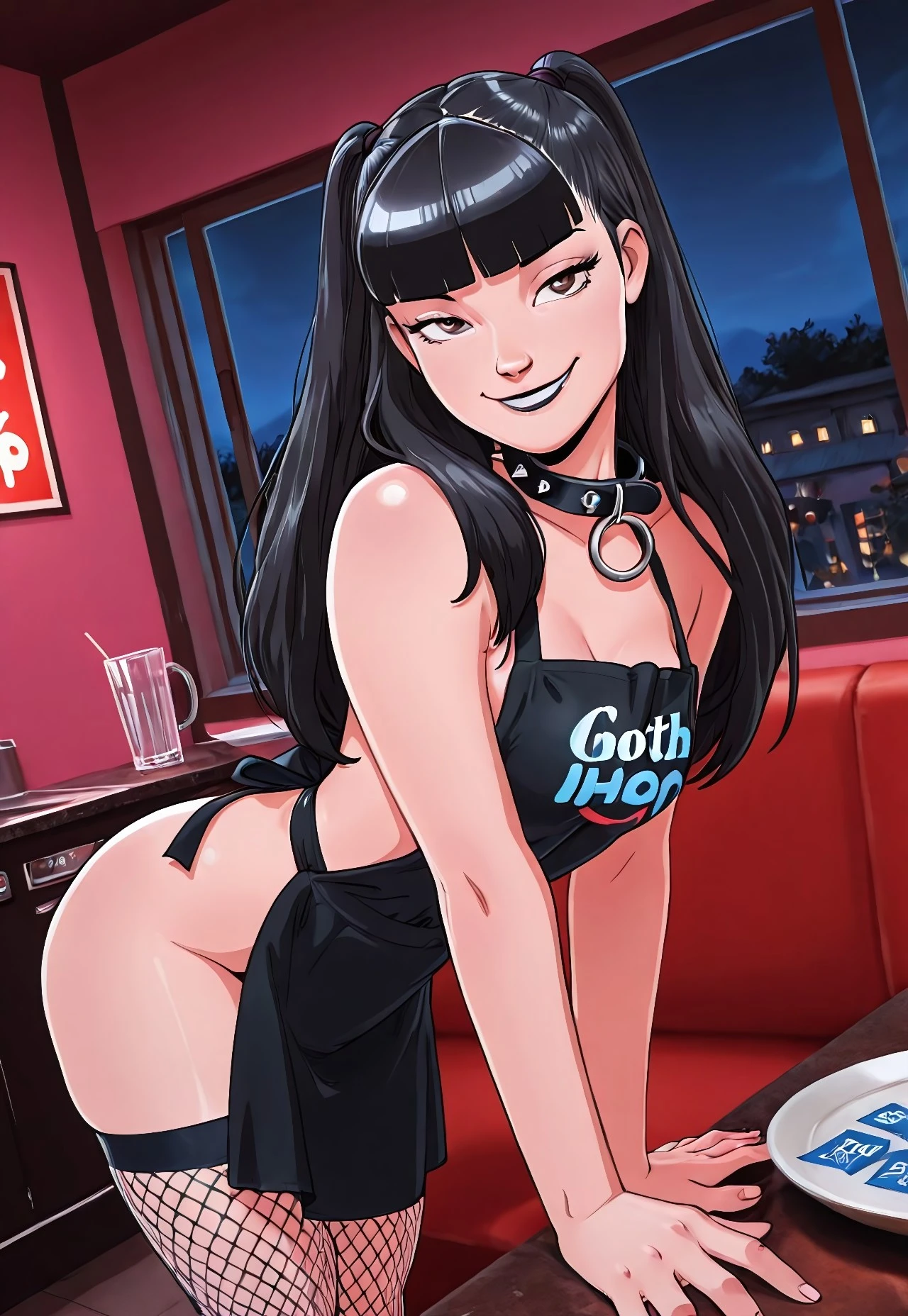 Paty_Tekuho, brown eyes, black hair, long hair, blunt bangs, pink collar, medium breasts,