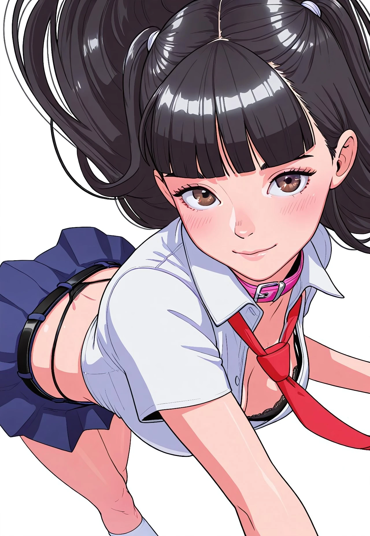 Red necktie, white collared shirt, short sleeves, bra peek, midriff, thong straps, black belt, blue skirt, white kneehigh socks,