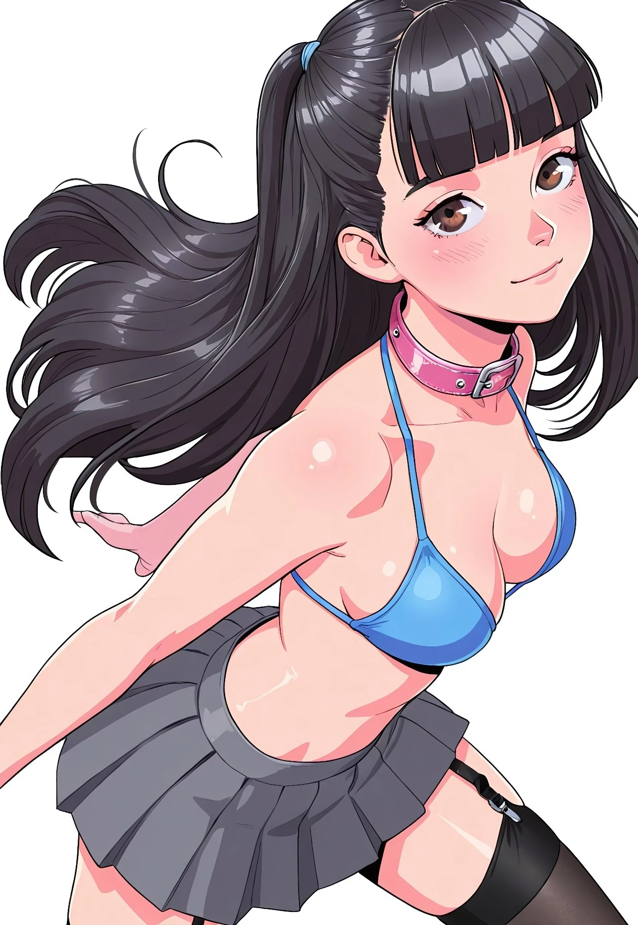 Blue bikini top, midriff, pleated skirt, grey skirt, garter straps, black thighhighs,